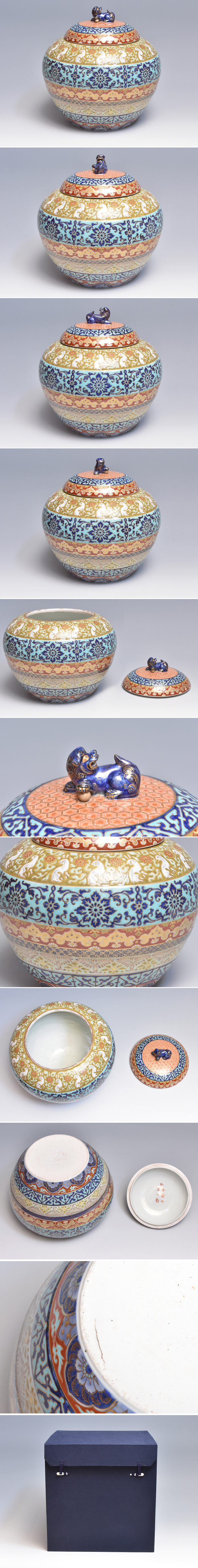 染付と色絵で玉と戯れる獅子を描き 地を艶のない黒褐色の鉄釉でむらなく塗りこめる。 その色調や側面に一対で付く象耳の耳から、 金属器を意識していると考えられるが、染付や 上絵の顔料の濃淡を使った獅子の体の斑文は 金属器では技術的に表現しにくい、陶磁器ならではの表現であろう。 なお、類似する作例などからは、本来は磁器製の脚付の台を下部に伴っていた 可能性が高い。(明治有田 超絶の美より抜粋) 本品は褐色地ではなく純粋な金彩、色絵を駆使して 様々な文様の段が施されております。 また蓋の摘みの獅子の玉が動く仕様になっております。 ここまでの素晴らしい出来の物は類例が少なく大変希少な一品です。 旧宮家伝来の一品です。 キズ等無く良い状態です。 ※撮影の際に生じた写り込みなどがございます。 ご理解の程よろしくお願い致します。 |