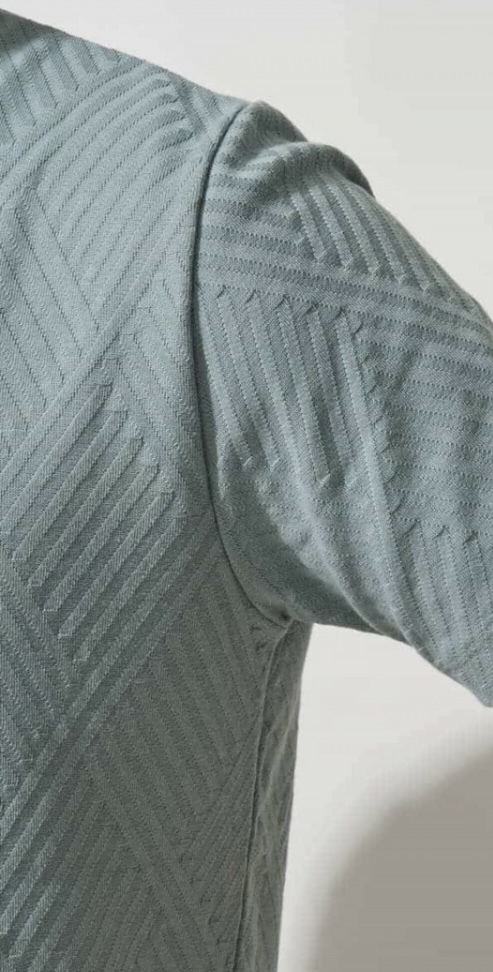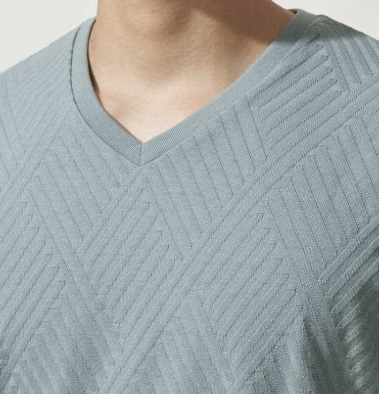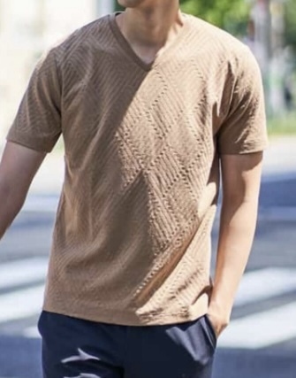 ダイヤ柄を編地で表現したきれいめVネック半袖カットソー。