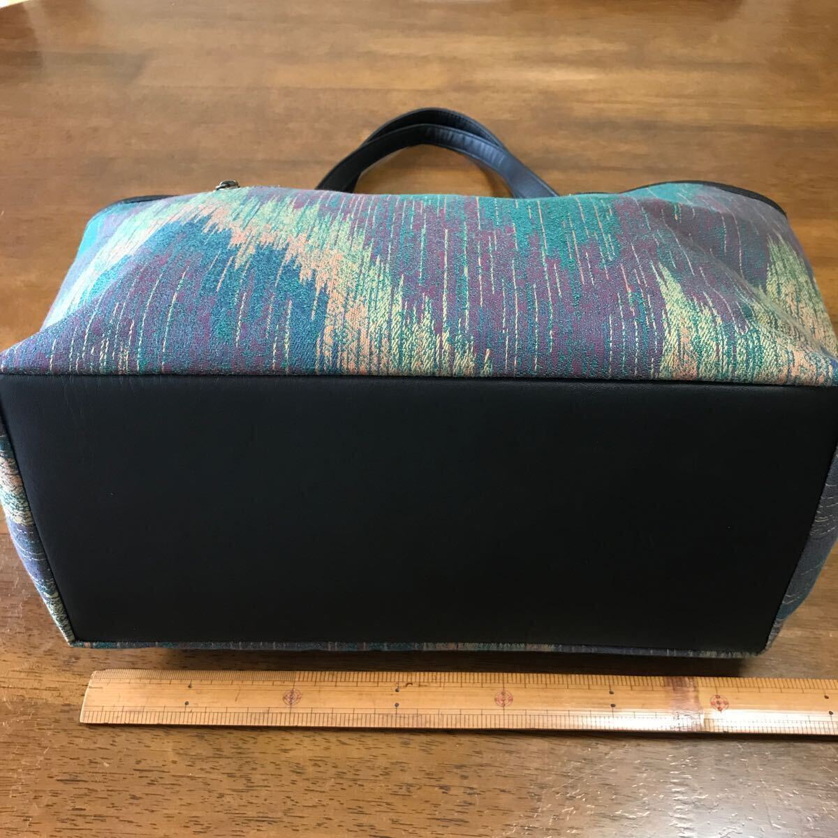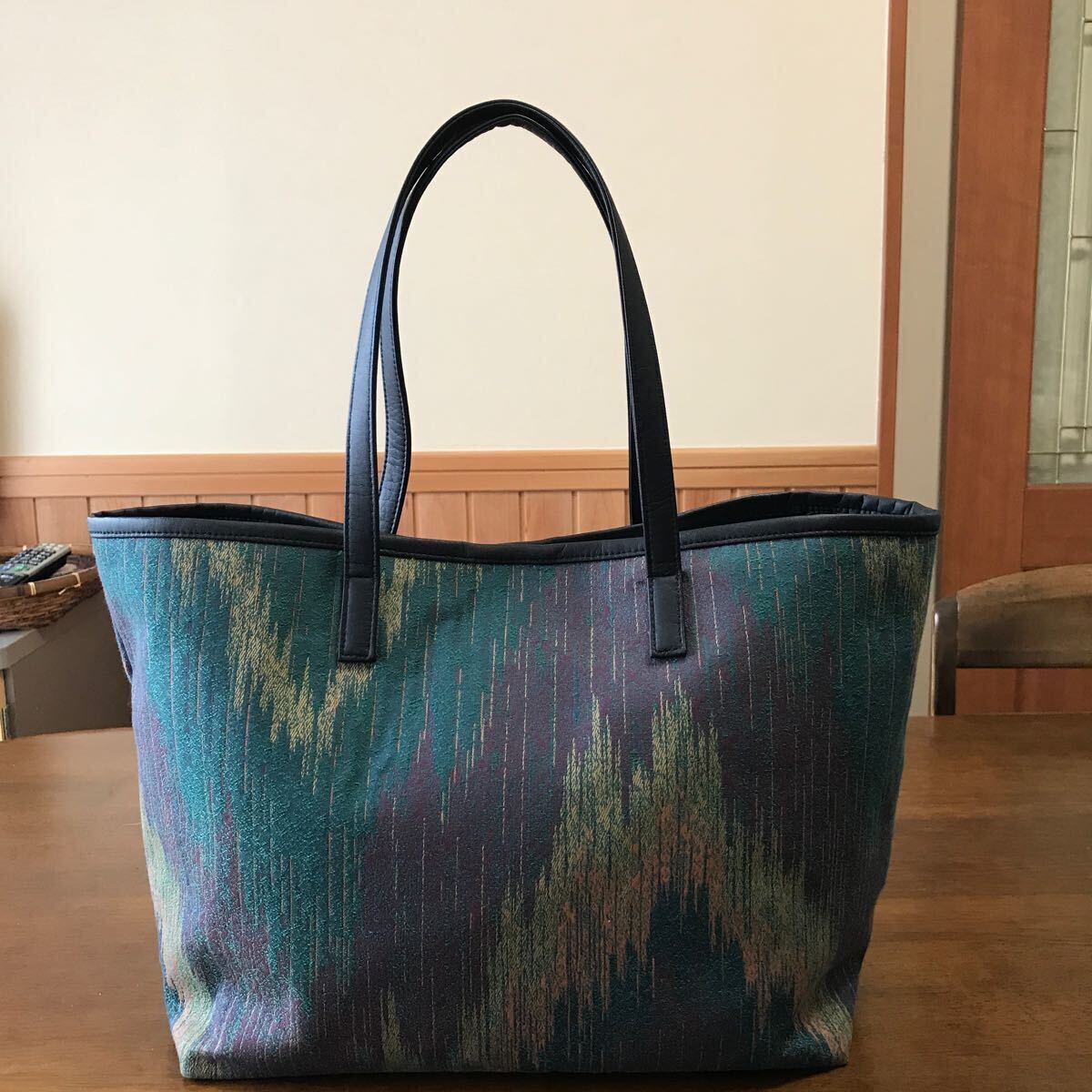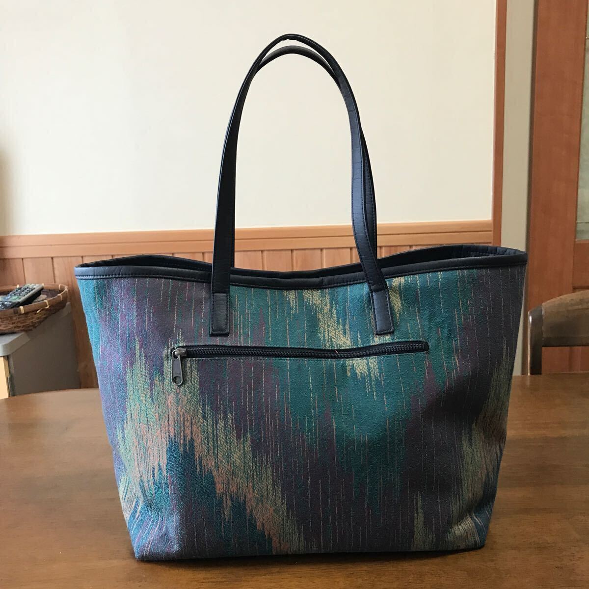 川島織物 繊細なかすり柄のジャガード生地の大きめのトートバッグを作りました。バッグの加工所で作製しました。バッグの口はドットボタン、内側はファスナー付きポケット、携帯電話が入る位のポケットが2つ、使い勝手の良いバッグです。