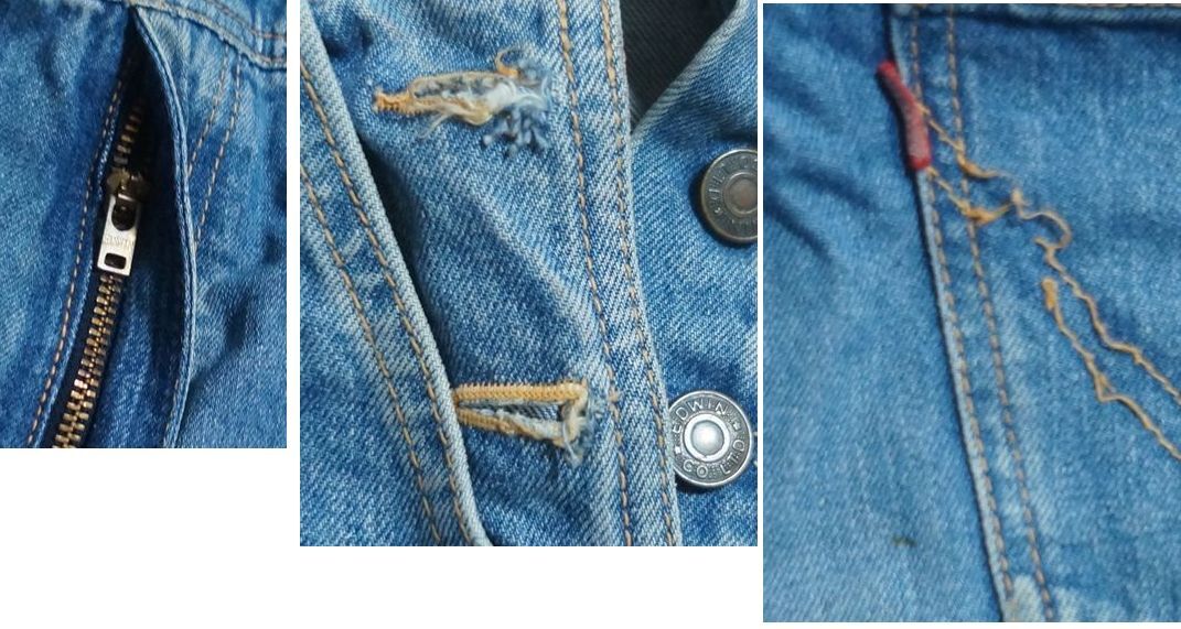 中古 全体薄汚れ、裾切りっぱなし、左サイドのボタンホールホツレヤブレ、バックポケットステッチホツレ、おしりに小汚れ(画像参照)
