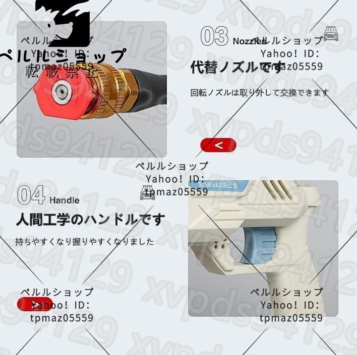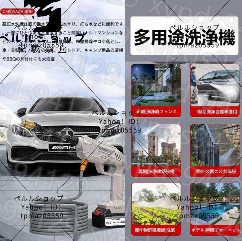 【高性能ハイパワー】高圧洗浄機のガンと本体が一体化した使い勝手の良いハンディウォッシャー。吐出圧力5Mpaのパワフルな高圧噴射で、ガンコな汚れを洗い流す高圧洗浄機です。家庭用洗浄機は高性能なパワーモーターを搭載して、水を素早く吸入・加圧して噴射します。多機能洗車ガンセット内容:本体、充電器、リチウムイオン充電バッテリー*2、回転ノズル、方向調整ノズル、フォームポット、フィルター付き専用給水管(5m)、ペットボトル用給水コネクター、収納箱.(ご注意:この商品はマキタブランドの製品ではありませんが、マキタバッテリーを使用することができます。)