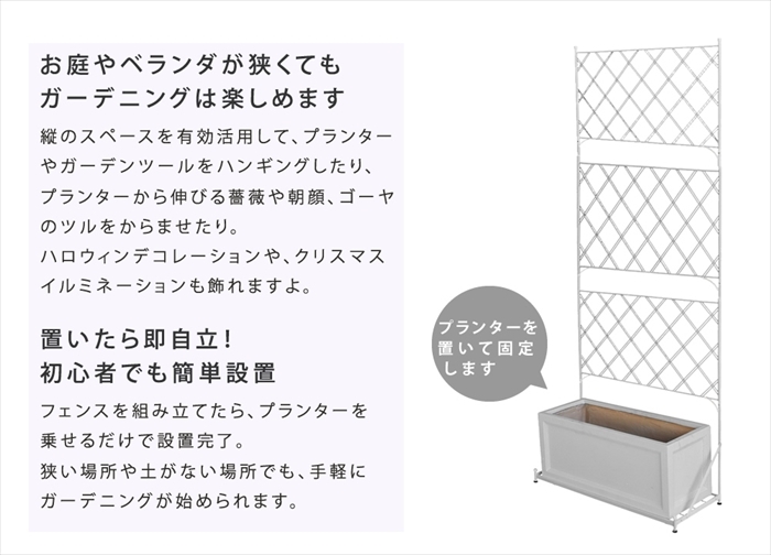 お庭やベランダが狭くてもガーデニングは楽しめます。 縦のスペースを有効活用して、プランターやガーデンツールをハンギングしたり、プランターから伸びる薔薇や朝顔、ゴーヤのツルをからませたり。 ハロウィンデコレーションや、クリスマスイルミネーションも飾れますよ。 置いたら即自立!初心者でも簡単設置。 フェンスを組み立てたら、プランターを乗せるだけで設置完了。 狭い場所や土がない場所でも、手軽にガーデニングが始められます。 |