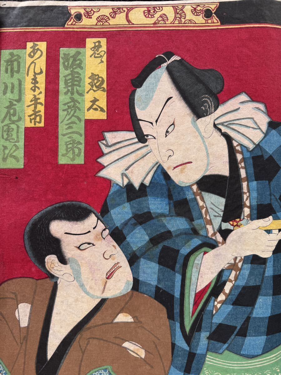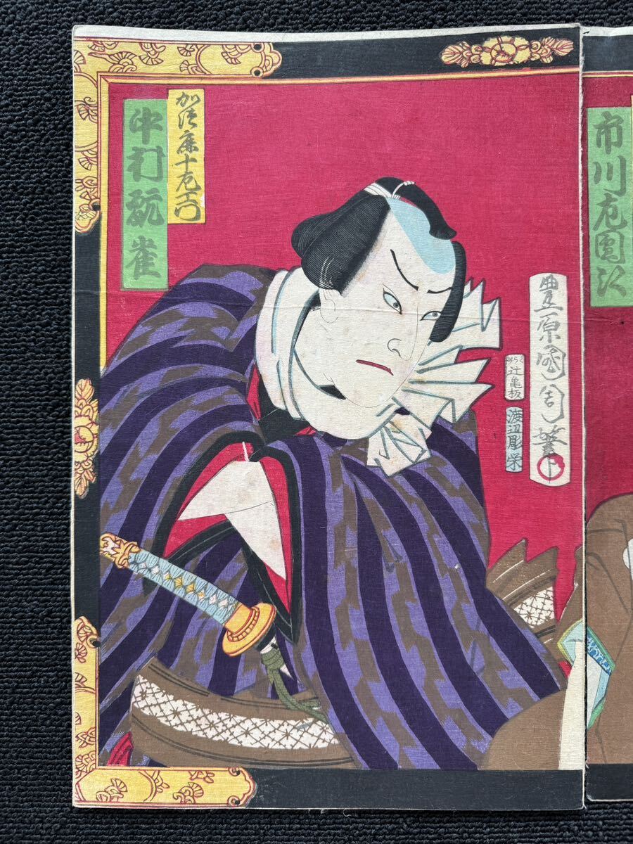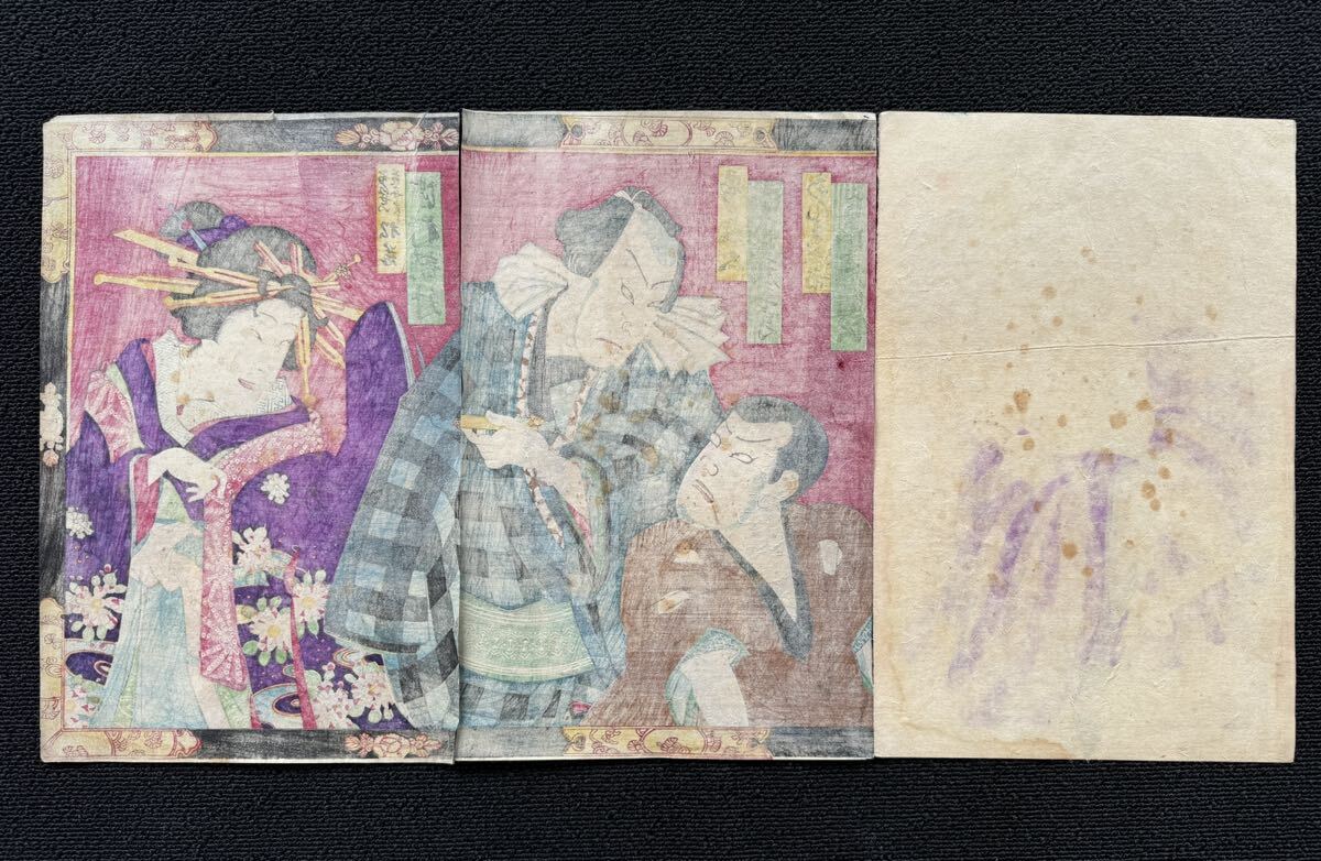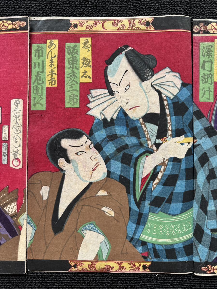 明治期/真作 豊原国周 本物浮世絵木版画 歌舞伎絵 役者絵 芝居絵 錦絵 大判 三枚続き 裏打ち