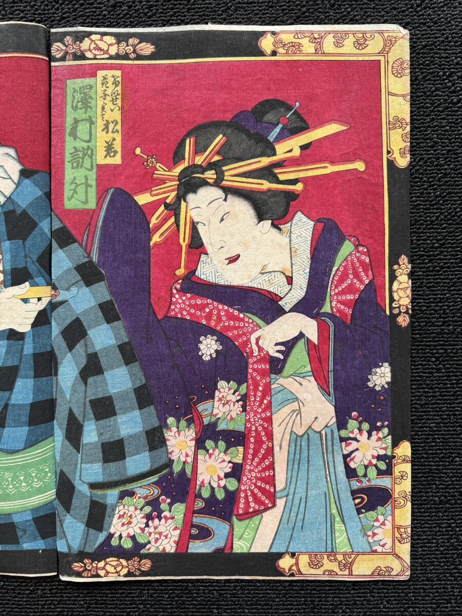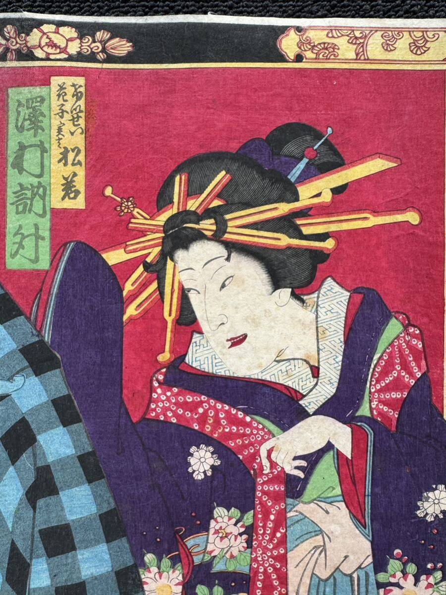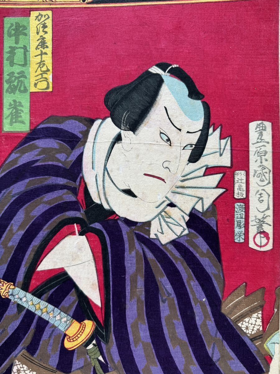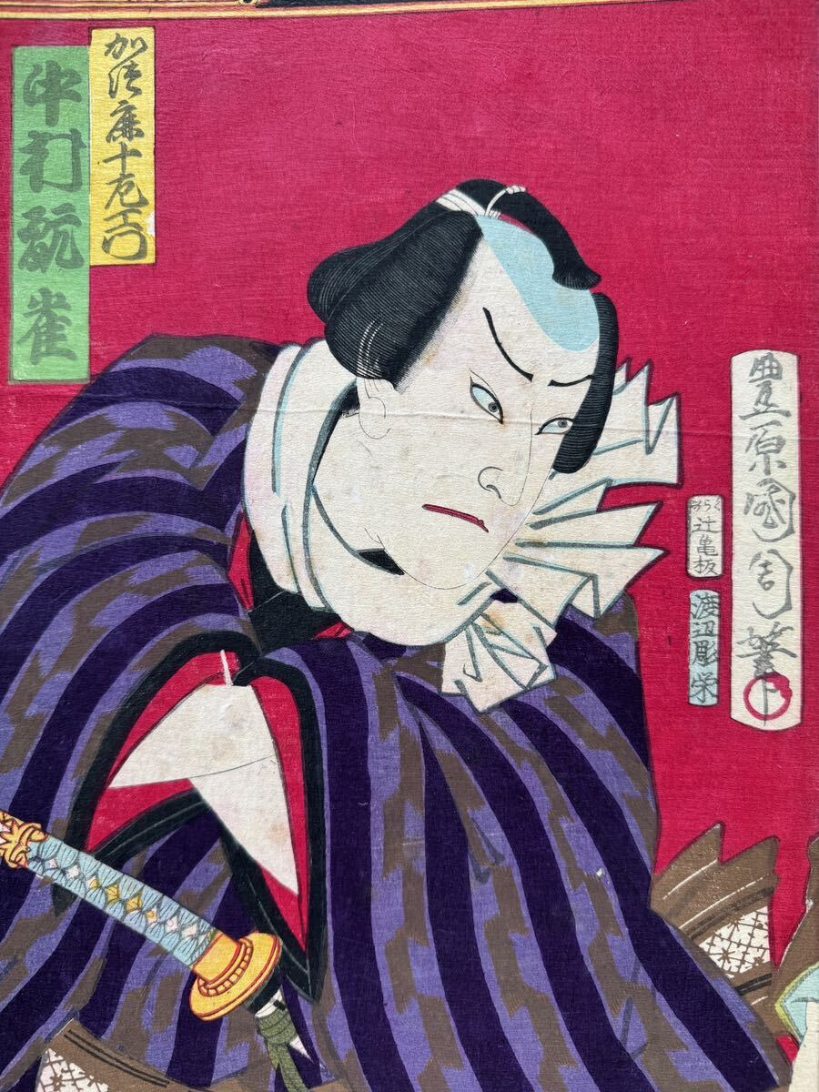 明治期/真作 豊原国周 本物浮世絵木版画 歌舞伎絵 役者絵 芝居絵 錦絵 大判 三枚続き 裏打ち