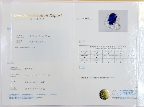 スリランカ産 大粒 10.14ct 非加熱 天然 サファイア 3.72ct 天然 ダイヤモンド プラチナ PT900 リング 指輪 【 GIA・CGL鑑別書付 】