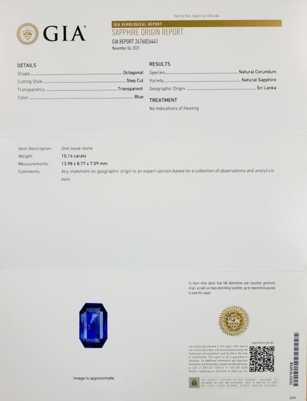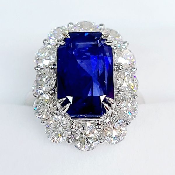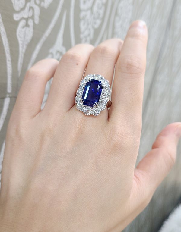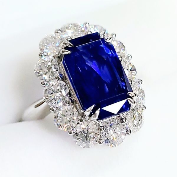 10.14カラットという圧倒的な存在感を放つサファイアは、熟練の職人の手によって優美なオクタゴナルステップカットに研磨されています。