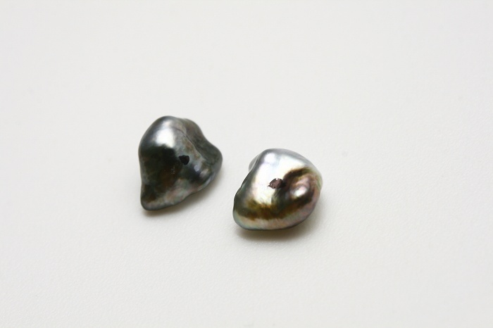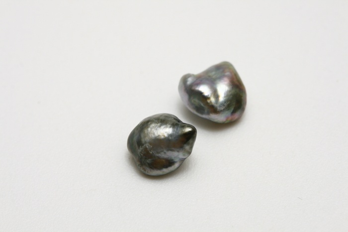 自然のオーラ満点のタヒチ黒蝶ケシパールペアルースです。クールなグレーのお色目が出ています。個性をアピールするパールジュエリーができます。 イヤリングやピアスなどにオススメです。 |