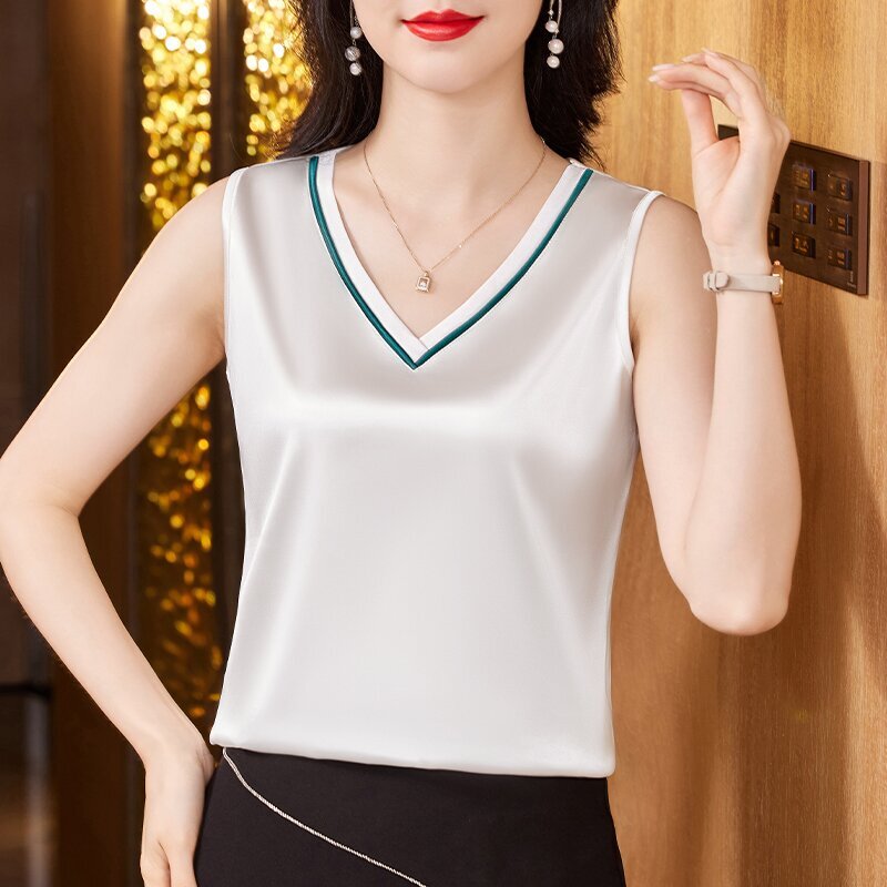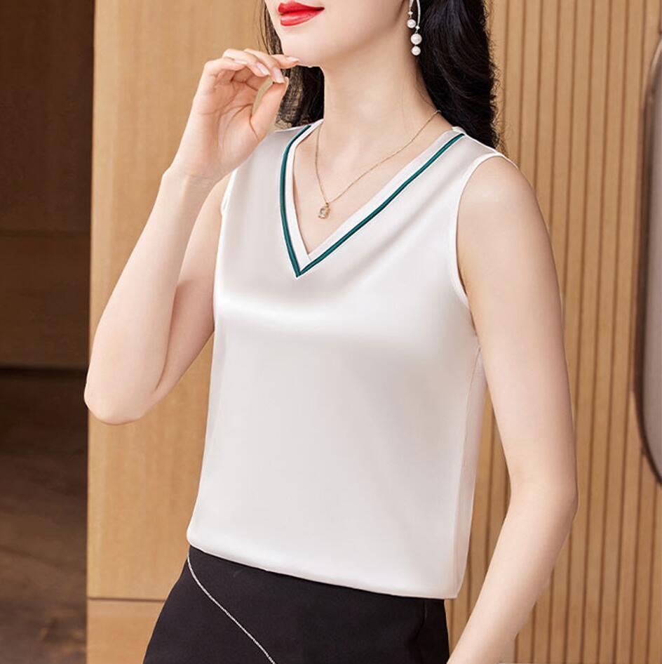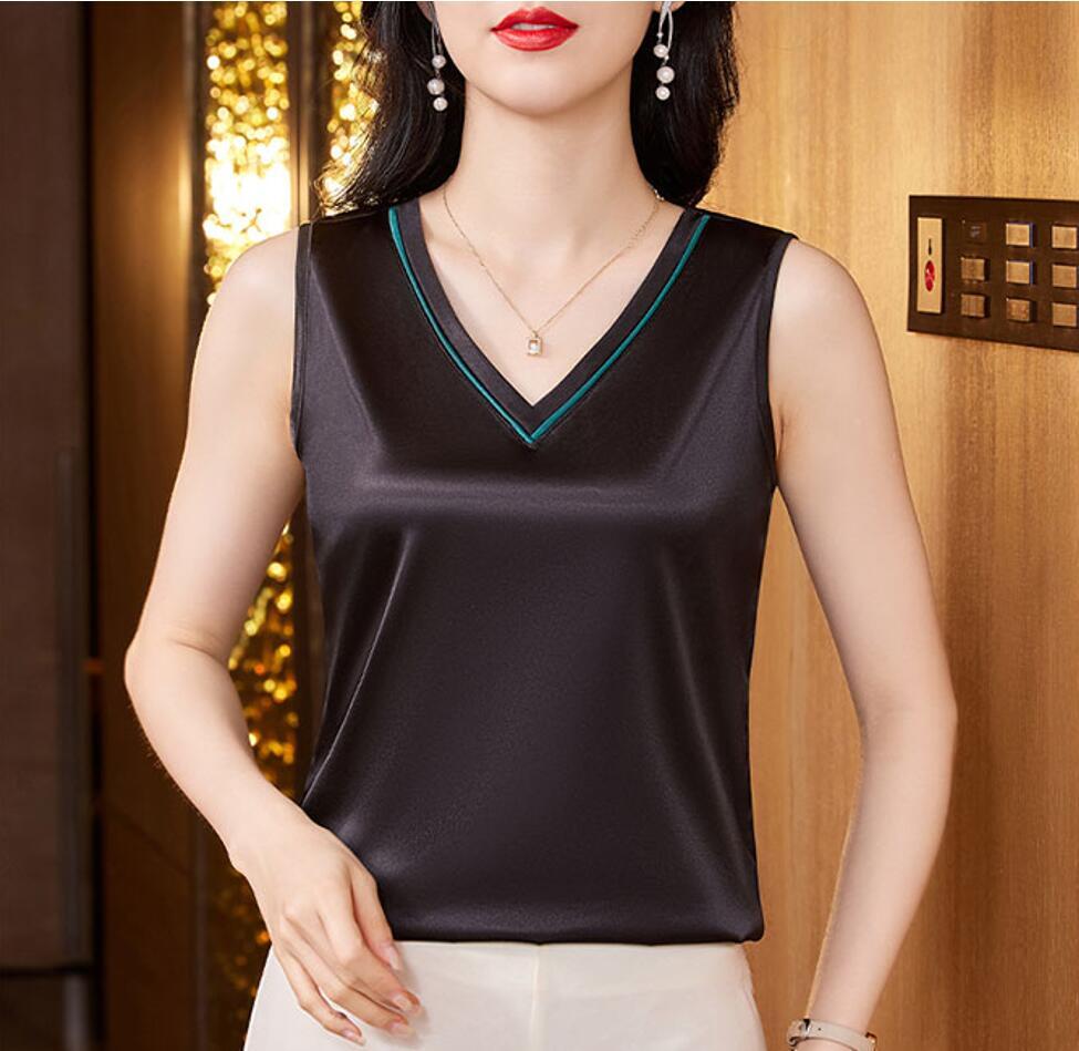 新品 人気推薦 /トップス ノースリーブ シャツブラウス 薄手 上品 光沢感 Vネック 着痩せ サテンブラウス オフィス通勤 大人 /ブラック