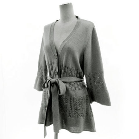【仕様】カーディガン ニット 七分袖 フレアスリーブ 鍵編み切替え ラメ リボンベルト 日本製 フロントボタン留め 品番IS-0000517 M10108M-SZ