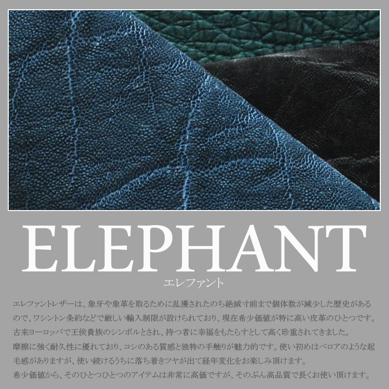 〇素材:象革、内面/イタリアンレザー(牛革)×レーヨンコットン、ファスナー(YKKエクセラ)