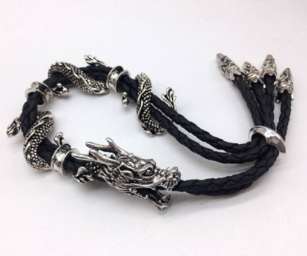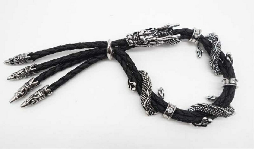 編み込んだレザーに躍動感溢れるドラゴン(龍)が巻きついたデザインのブレスレットです。