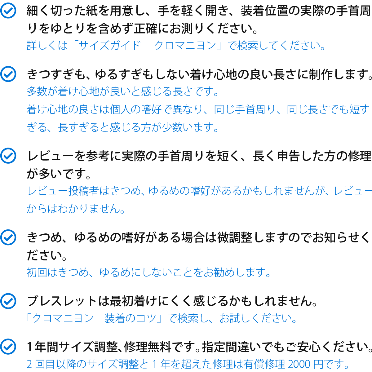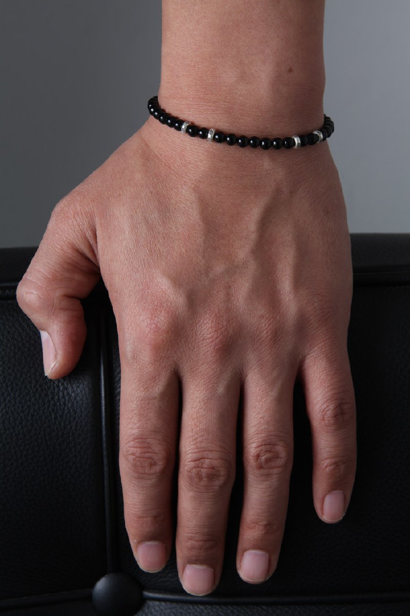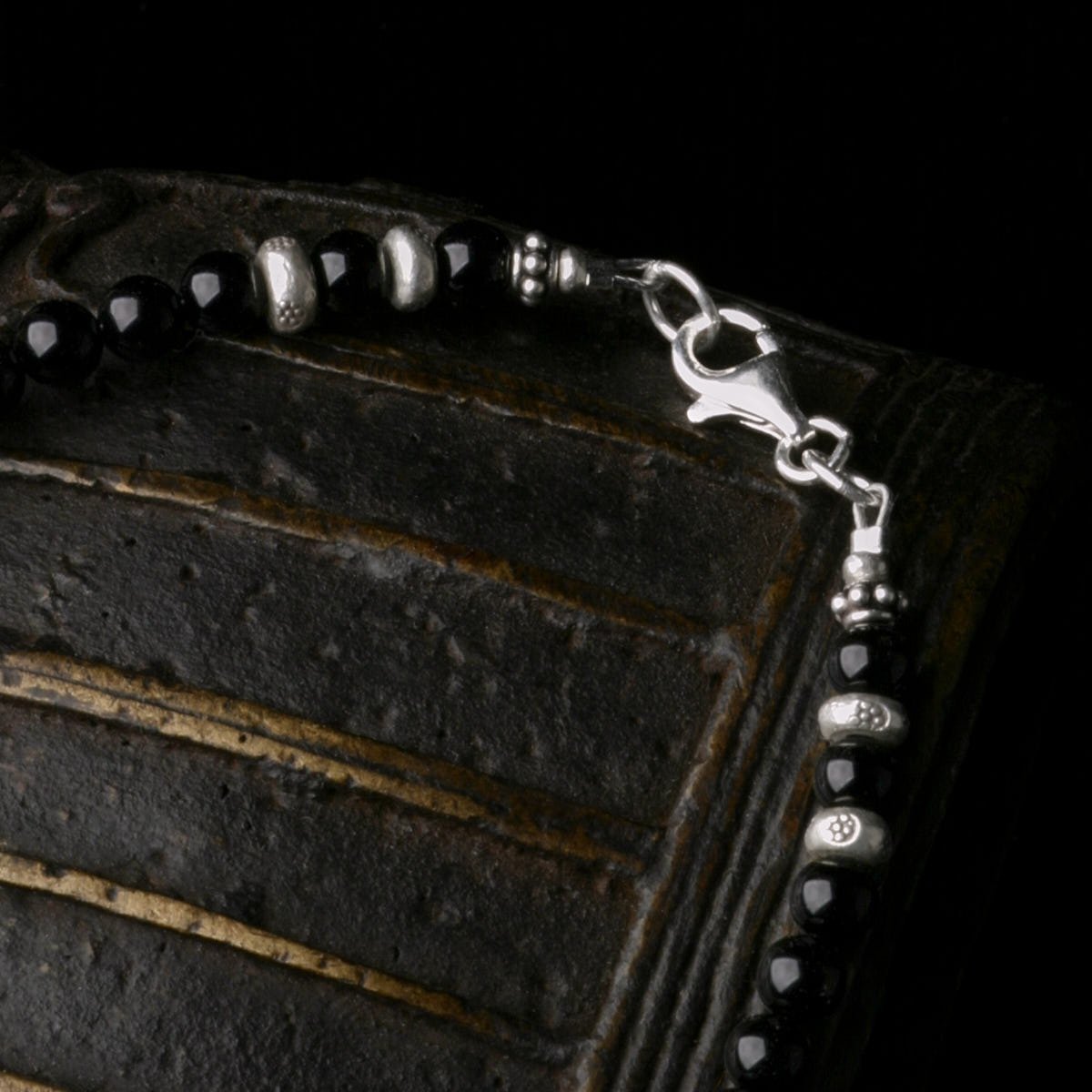 漆黒に輝くブラックオニキス カレンシルバービーズとブラックオニキスでプエブロ族(北アメリカ)の伝統的装身具のパターンを表現したブレスレットです。 ブラックオニキスは邪念を払い感情をコントロールできる力を持つと信じられ、また黒魔術から身を守る護身符として身に着けられました。 さりげない細さ、主張し過ぎないモノクロームの配色は、上質な印象を引き出します。 身に着けるほどに手放せないアイテムになることでしょう。 留め具には、高品質なスターリングシルバー(SV925/イタリア製)を使用しています。デザインの邪魔にならない小ぶりで控えめなものを選んでいます。 ワイヤーをかしめるストッパーには、アルジェンティウムシルバー(SV940/アメリカ製)を現在採用しています。 一般的なストッパーより、耐久性と強度にはるかに優れ、変色しにくく、白い輝きを持続します。 メンズ/レディース兼用。手首周り20cmまで。 カレン族の手仕事によるシルバービーズ カレンシルバーはタイの山岳民族カレン族の手仕事により、伝統的手法で丹念に作られます。 マットな質感が特徴で、刻印一つ一つが異なる表情を持ち、素朴な温かみが心に響きます。 自然と共存する彼らの作るものには、身近に暮らす動植物や生活道具などを象ったものが多くあります。 そこには自然を畏れ敬うアニミズムの思想が流れています。 カレンシルバーの銀純度 シルバーはやわらかい金属です。 純銀では傷がつきやすく装飾品に向かないため、耐久性や強度を補う目的で銅などの金属を混ぜ合わせます。 一般的な装飾品は銀92.5%+銅7.5%の合金が用いられます。 これはスターリングシルバー(Sterling Silver)、SV925と呼ばれます。 カレンシルバーは銀95%+銅5%のSV950が用いられます。 SV925は昔ながらの手仕事には固すぎるためです。 プエブロ族の伝統模様 プエブロ族は先祖伝来の信仰や風習を守り続け、伝統に忠実な装身具を作ることで知られています。 彼らの信仰と世界観を落とし込んだ幾何学的で独特のパターンは不思議と心地よく、調和を生み出す伝統模様の奥深さを感じられます。 細部にこだわり抜いた美しさ 制作は細部までこだわることで美しさと心地よさを追求しています。 ブラックオニキスは線上のビーズを一つひとつ指でくるくると回し、ブレがあるものを取り除きます。 これらが含まれるとラインがガタガタになるからです。 真っ直ぐ中心線が通ったものだけを選りすぐると1本から3分の1程が残ります。 こうすることで流れるような曲線美を描きます。 ※入荷時期によって色味、形状、表情に個体差があったり、若干の違いが生じる場合があります。 ※色はできる限り正確に表現するよう努めていますが、モニターやモバイル機器の設定、撮影時の照明、写真の拡大などの違いにより、実物よりも大きく太く、実際の色と異なって見える場合があります。 キーワード ブレスレット ブラックオニキス シンプル プエブロ族 黒 【素材】 シルバービーズ SV950(銀純度95%)/タイ製 留め具 SV925/イタリア製 ストッパー SV940/アメリカ製 ステンレスワイヤー/日本製 ブラックオニキス/インド 【寸法】 シルバービーズ直径4.5~5mm ブラックオニキスビーズ直径4~4.5mm 【サイズ】 手首周り13~20cm(20cm超えはクロマニヨンのYahoo!ショッピング店をご利用ください) 【生産国】 日本 ![]() サイズガイド
