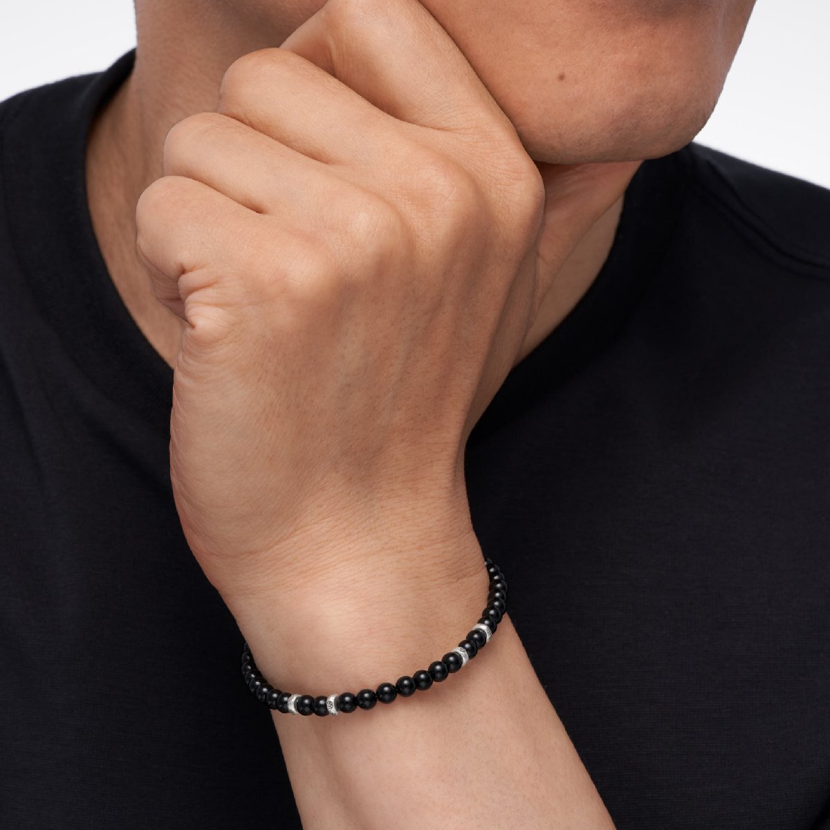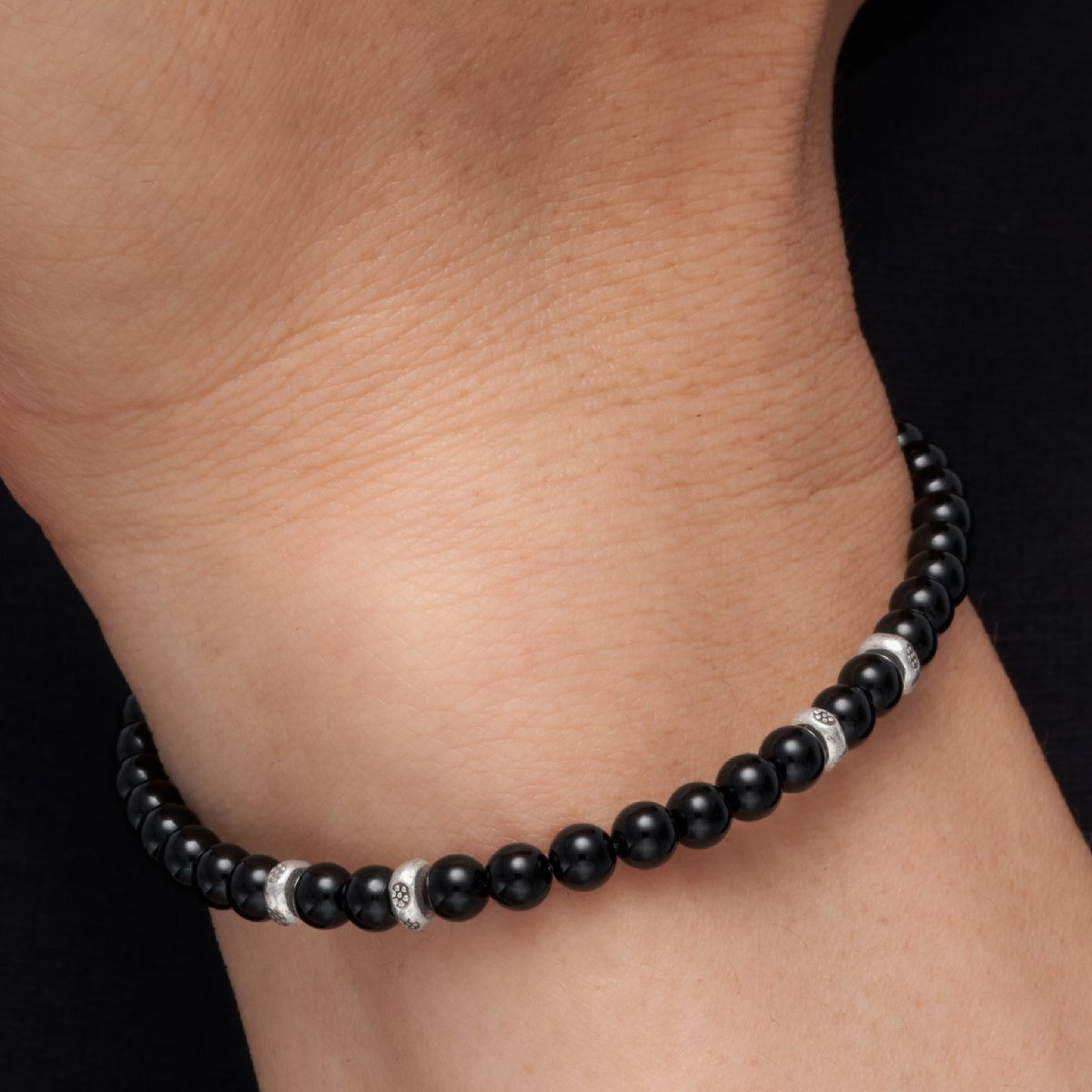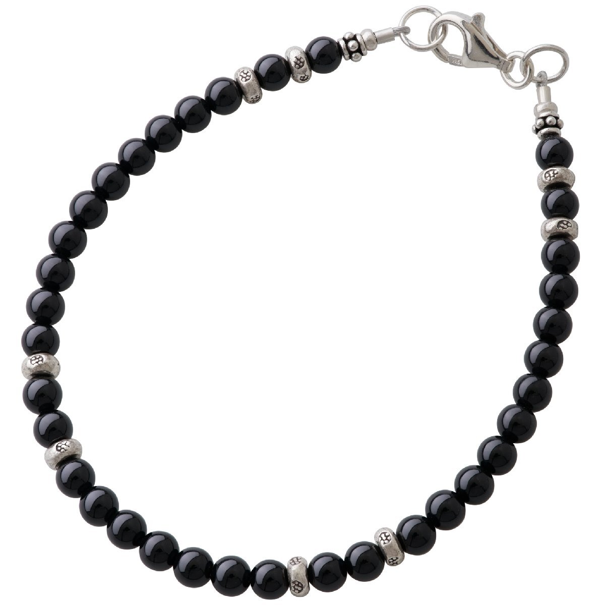 漆黒に輝くブラックオニキス カレンシルバービーズとブラックオニキスでプエブロ族(北アメリカ)の伝統的装身具のパターンを表現したブレスレットです。 ブラックオニキスは邪念を払い感情をコントロールできる力を持つと信じられ、また黒魔術から身を守る護身符として身に着けられました。 さりげない細さ、主張し過ぎないモノクロームの配色は、上質な印象を引き出します。 身に着けるほどに手放せないアイテムになることでしょう。 留め具には、高品質なスターリングシルバー(SV925/イタリア製)を使用しています。デザインの邪魔にならない小ぶりで控えめなものを選んでいます。 ワイヤーをかしめるストッパーには、アルジェンティウムシルバー(SV940/アメリカ製)を現在採用しています。 一般的なストッパーより、耐久性と強度にはるかに優れ、変色しにくく、白い輝きを持続します。 メンズ/レディース兼用。手首周り20cmまで。 カレン族の手仕事によるシルバービーズ カレンシルバーはタイの山岳民族カレン族の手仕事により、伝統的手法で丹念に作られます。 マットな質感が特徴で、刻印一つ一つが異なる表情を持ち、素朴な温かみが心に響きます。 自然と共存する彼らの作るものには、身近に暮らす動植物や生活道具などを象ったものが多くあります。 そこには自然を畏れ敬うアニミズムの思想が流れています。 カレンシルバーの銀純度 シルバーはやわらかい金属です。 純銀では傷がつきやすく装飾品に向かないため、耐久性や強度を補う目的で銅などの金属を混ぜ合わせます。 一般的な装飾品は銀92.5%+銅7.5%の合金が用いられます。 これはスターリングシルバー(Sterling Silver)、SV925と呼ばれます。 カレンシルバーは銀95%+銅5%のSV950が用いられます。 SV925は昔ながらの手仕事には固すぎるためです。 プエブロ族の伝統模様 プエブロ族は先祖伝来の信仰や風習を守り続け、伝統に忠実な装身具を作ることで知られています。 彼らの信仰と世界観を落とし込んだ幾何学的で独特のパターンは不思議と心地よく、調和を生み出す伝統模様の奥深さを感じられます。 細部にこだわり抜いた美しさ 制作は細部までこだわることで美しさと心地よさを追求しています。 ブラックオニキスは線上のビーズを一つひとつ指でくるくると回し、ブレがあるものを取り除きます。 これらが含まれるとラインがガタガタになるからです。 真っ直ぐ中心線が通ったものだけを選りすぐると1本から3分の1程が残ります。 こうすることで流れるような曲線美を描きます。 ※入荷時期によって色味、形状、表情に個体差があったり、若干の違いが生じる場合があります。 ※色はできる限り正確に表現するよう努めていますが、モニターやモバイル機器の設定、撮影時の照明、写真の拡大などの違いにより、実物よりも大きく太く、実際の色と異なって見える場合があります。 キーワード ブレスレット ブラックオニキス シンプル プエブロ族 黒 【素材】 シルバービーズ SV950(銀純度95%)/タイ製 留め具 SV925/イタリア製 ストッパー SV940/アメリカ製 ステンレスワイヤー/日本製 ブラックオニキス/インド 【寸法】 シルバービーズ直径4.5~5mm ブラックオニキスビーズ直径4~4.5mm 【サイズ】 手首周り13~20cm(20cm超えはクロマニヨンのYahoo!ショッピング店をご利用ください) 【生産国】 日本 ![]() サイズガイド