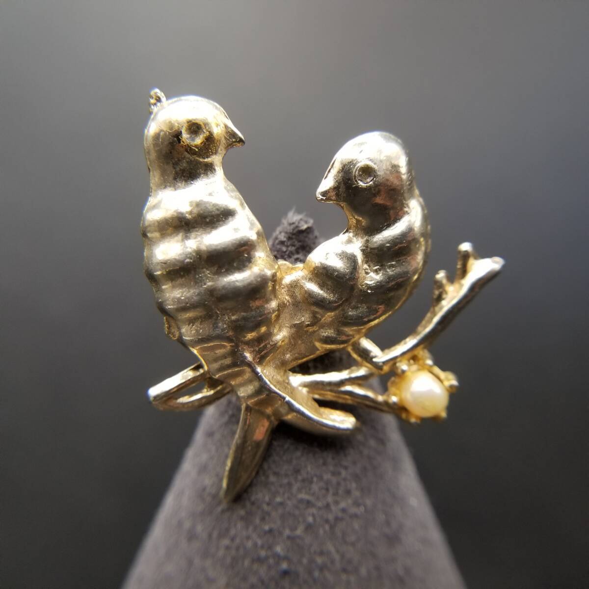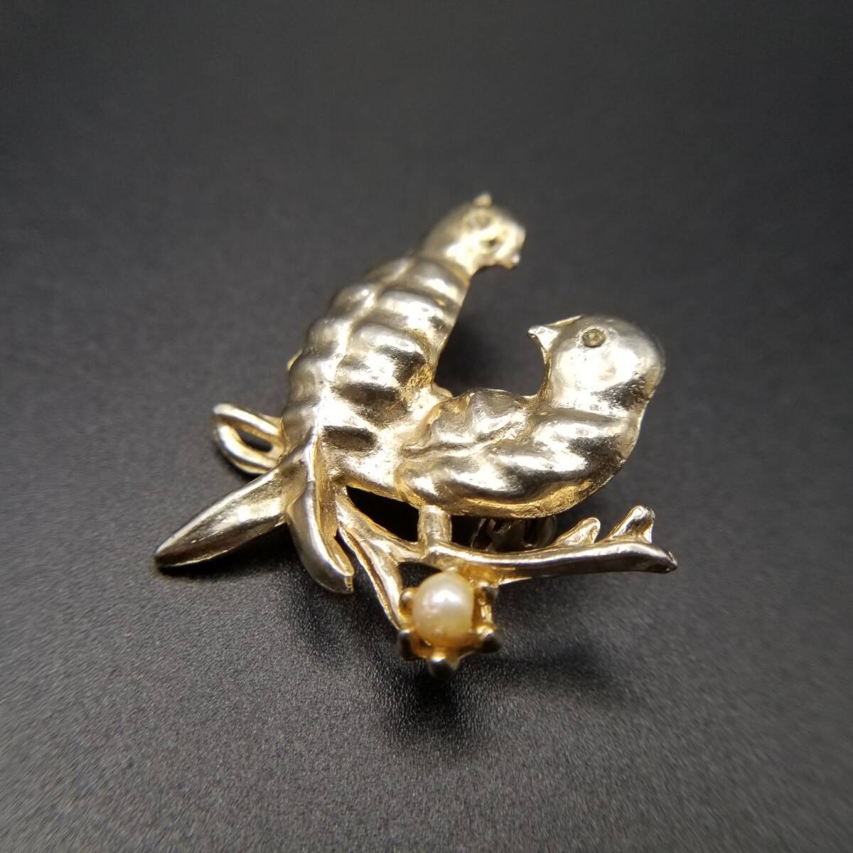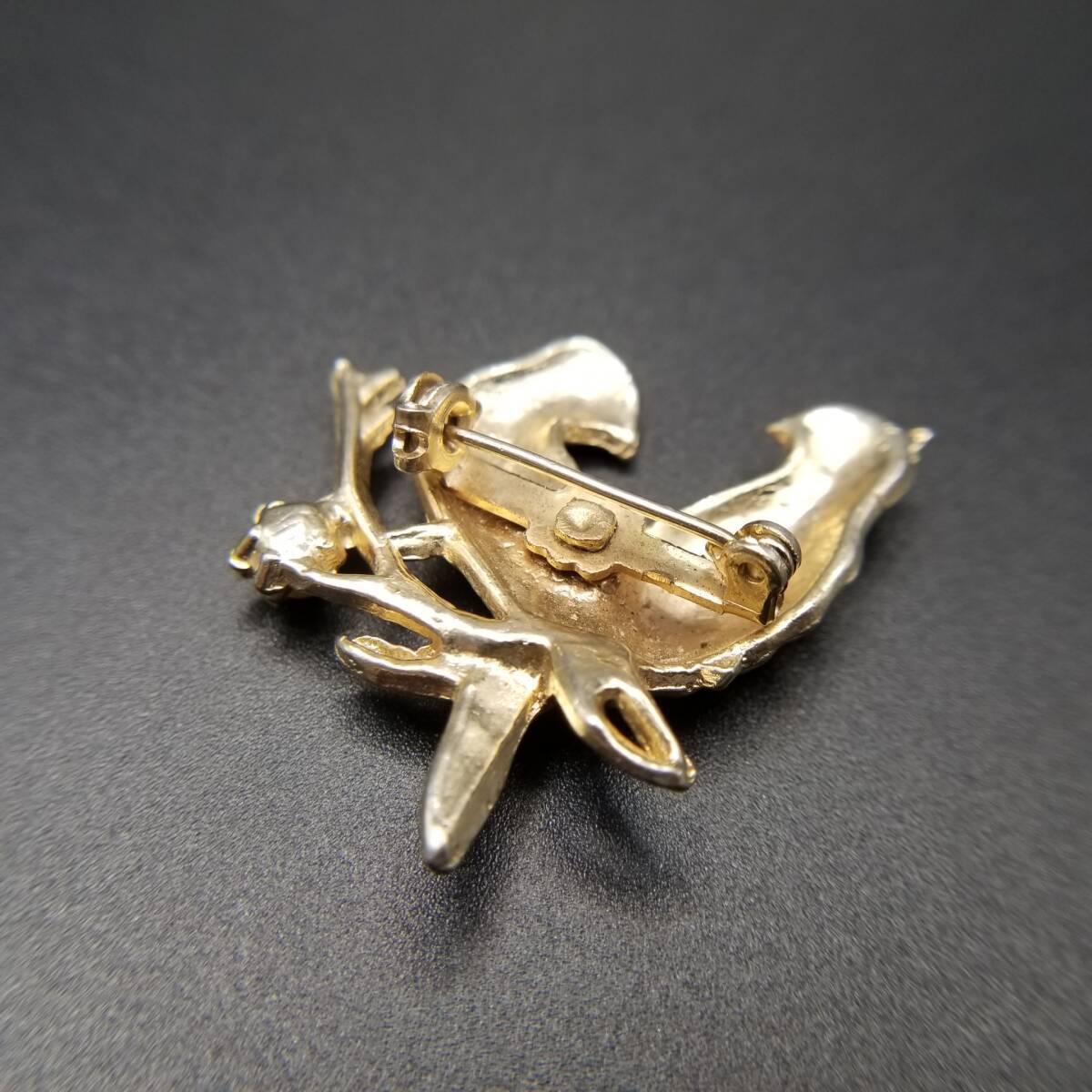木にとまる2羽の鳥 パール装飾 ヴィンテージ ブローチ ゴールドトーン 小ぶり レトロキュート 動物 鳥モチーフ 自然 Y16-Y