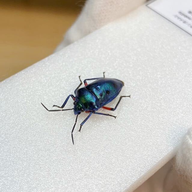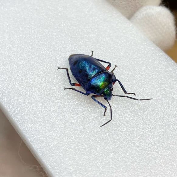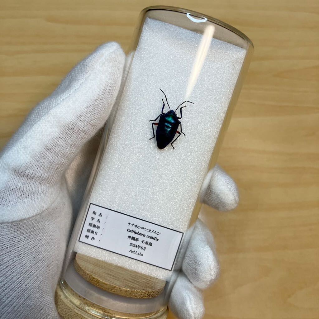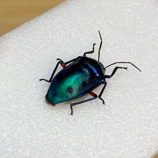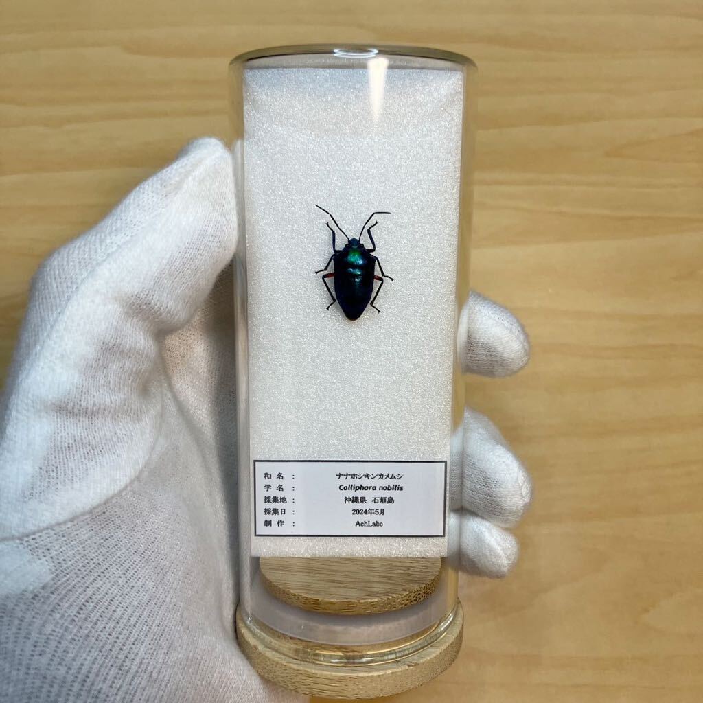南西諸島に住むカメムシで、金緑色の美しい金属光沢をはなち7個の濃紺色の紋があるがあることからその名がつきました。標本にして乾燥させると体色が青色に変化するのも特徴的です。