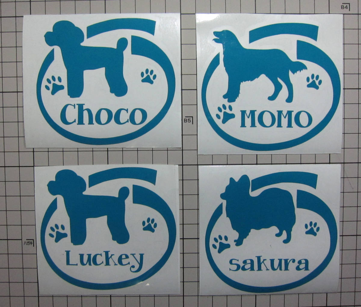 DOG IN CAR(犬が乗ってます)カッティングステッカー 愛犬の名前入り 色の付いたイラスト部分だけが残るカッティングステッカーです。 車や玄関など色々な場所に貼れます! かなりの耐水性があり、屋外使用で5年程度の耐久力があります。 標準サイズは9.0cm×8.2cmとなります。 サイズ変更も可能で、3.0cm×2.7cm~14.0cm×12.6cmサイズ程度まで同額で対応致します。 最下部にご連絡頂いた愛犬の名前を入れて製作します。 文字タイプは、ひらがな/カタカナ/漢字/アルファベットなど何でも可能です。 デザインはトイプードル、スピッツ、チワワ(ロング/スムース)、パピヨン、ミニチュアシュナウザー、ミニチュアダックス(ロング/スムース)などあらゆる犬種からお選び頂けます。 色は最後の画像のものに全て対応しています。 送料は普通郵便で10.0cm×9.0cmまでが110円、それ以上のサイズは定型外郵便となり140円になります。 |