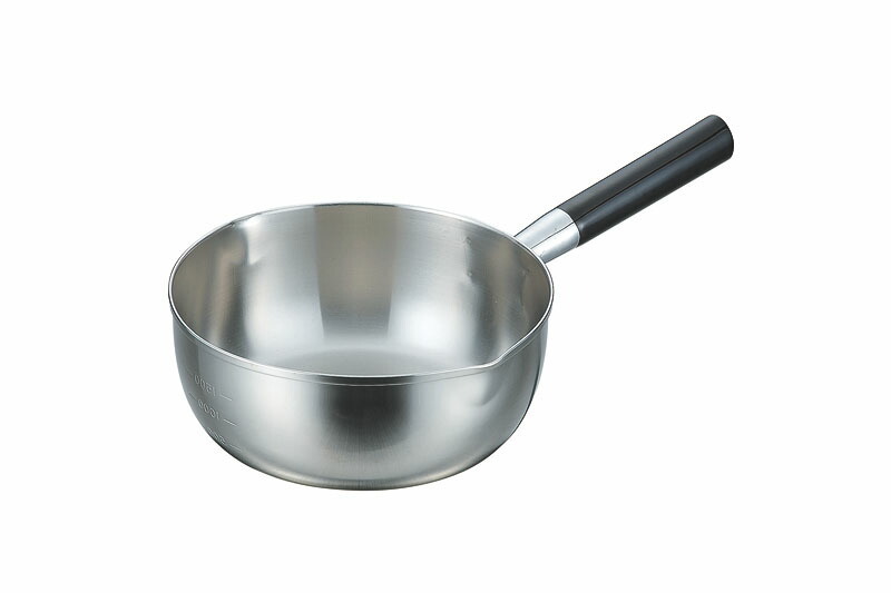 目盛付、両口仕様です。熱伝導の良い軟鉄を保温性と耐蝕に優れた18-10ステンレスでサンドイッチした素材です。