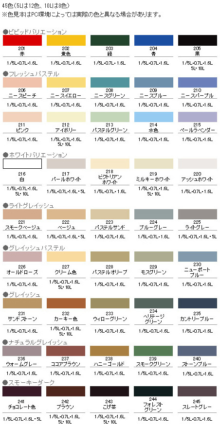 | ●特殊フッ素樹脂、反応硬化型シリコン変性アクリル樹脂、紫外線劣化防止剤(HALS)の相乗効果により、汚れにくく、耐久性が格段にすぐれた高性能塗料です。●白系塗料には自動車用にも使用されている高性能二酸化チタンを使用しています。●いやな臭いのしない無臭タイプで、1回塗りで仕上がります。●サビドメ剤、防カビ剤を配合していますので、サビやカビの発生を防ぎます。●厚塗りしてもタレにくく、たいへん塗りやすい塗料です。 ●フッ素樹脂配合・汚れにくい ●サビ止め剤配合・サビを防ぐ●カビ止め剤配合・カビを防【注意事項】●うすめ方:塗りにくいときは水(5%以内)でうすめて下さい。●乾燥時間:夏期/30分~1時間 冬期/2~3時間。●標準塗り面積:【1回塗り】 1/5L 1.4~1.9平米 (タタミ0.9~1.2枚分) /0.7L 5.0~6.6平米 (タタミ3~4枚分)1.6L 11~15平米 (タタミ6~9枚分) /5L 36~47平米 (タタミ21~28枚分) 10L 71~94平米 (タタミ42~56枚分) |