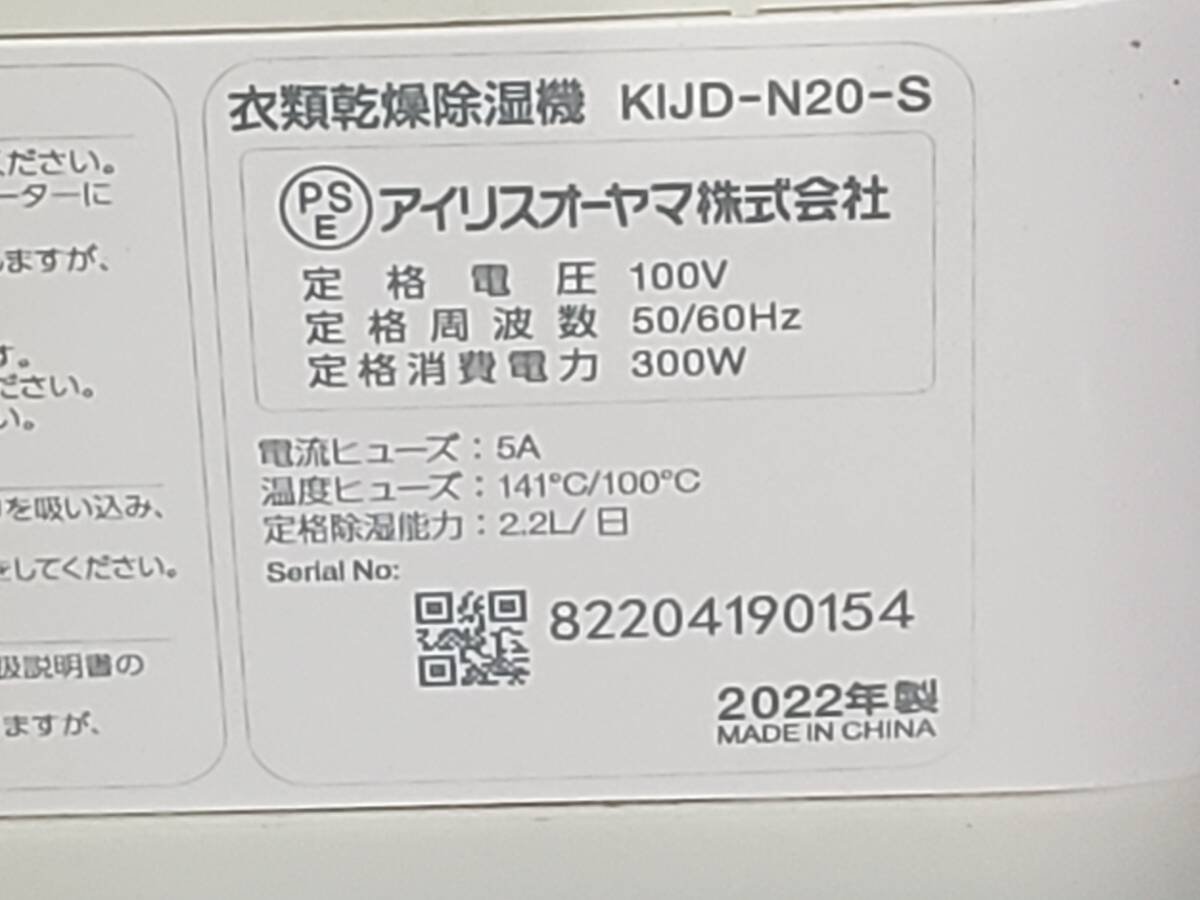 Q5991 ジャンク/現状渡し☆売切☆アイリスオーヤマ KIJD-N20 衣類乾燥除湿機 2022年製