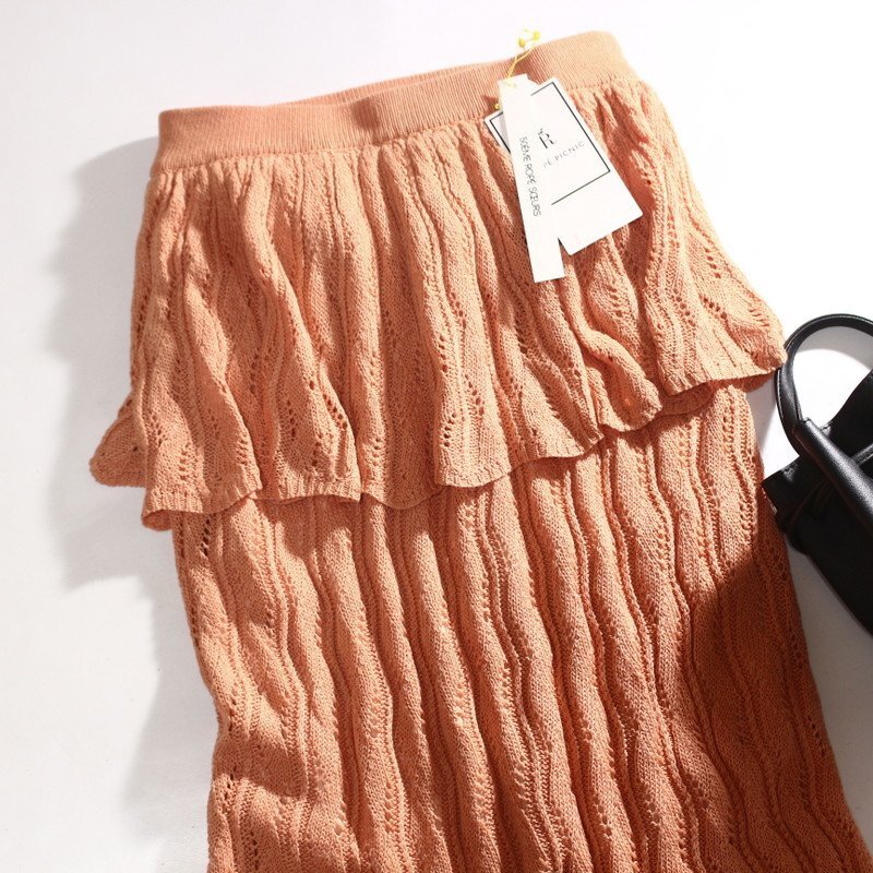新品 未使用 ロペ ピクニック ROPE' PICNIC 春 夏 綿 麻 リネン レースニット 飾フリル レーススカート 7号 36 淡い オレンジ