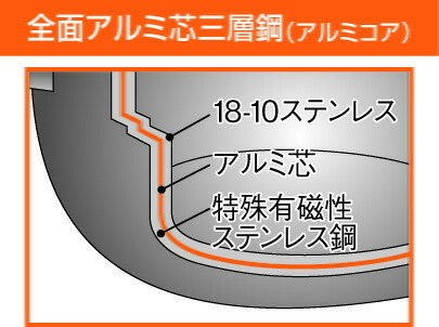 鉄よりも軽く、さらに熱伝導にも優れたアルミニウムをステンレスで挟んだ全面アルミ芯三層鋼は、素材が軽い分、厚みを増して、よりマイルドに熱が伝わり、焦げ付きにくいのが特長です。