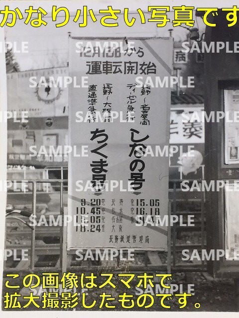 背後に複線レール、羊羹など広告看板(権堂駅前 平和電気と書いてある気がします)の後ろに病院、横に新聞掲示板あり。市街の駅前で撮影したと思われます。