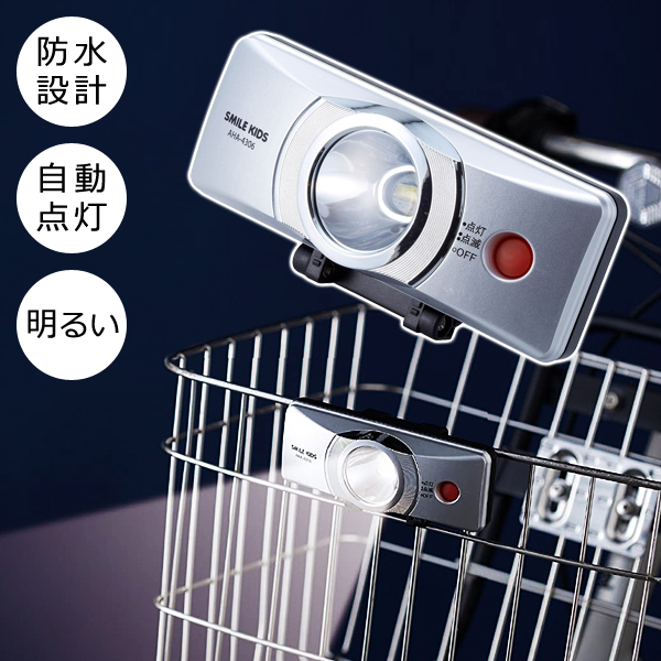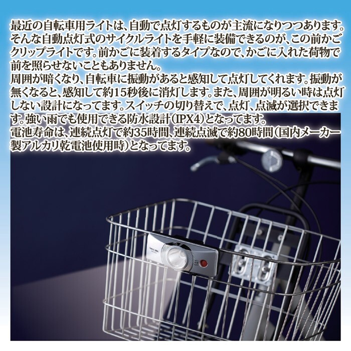 自転車ライト 自転車用 ヘッドライト ランプ 前かご用 カゴ 篭 籠 取り付け 防水 自動点灯 振動 夜間 明るい 点滅 ランプ 照明 雨天対応