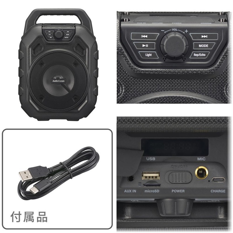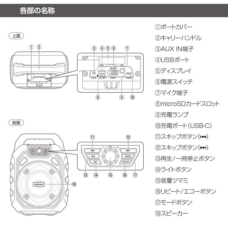 ■ 接続端子:USB-Cポート(給電)、USB-Aポート、microSDカードスロット、AUX IN端子(φ3.5mmステレオミニジャック)、マイク端子 (φ6.3mm モノラルジャック)