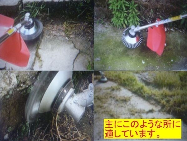 | 商品説明 | 草刈り機の特殊刃15㎝・2個 替刃金属ブラシ・ コンクリート、ブロック、段差などに◎ 15㎝ 替刃金属ブラシ・2個の価格です。 装着参考写真は15㎝です。 使用例の写真はごく一般的なマキタの草刈り機です。 口径25.4のものですので、国内で流通している、エンジン、電動とわずさまざまな草刈り機でご使用いただけます。