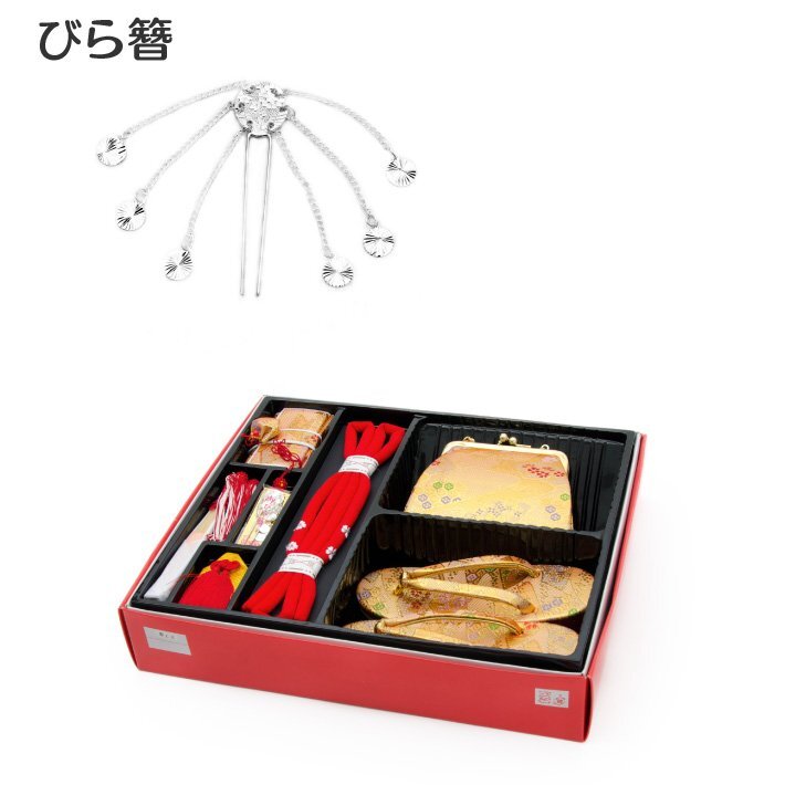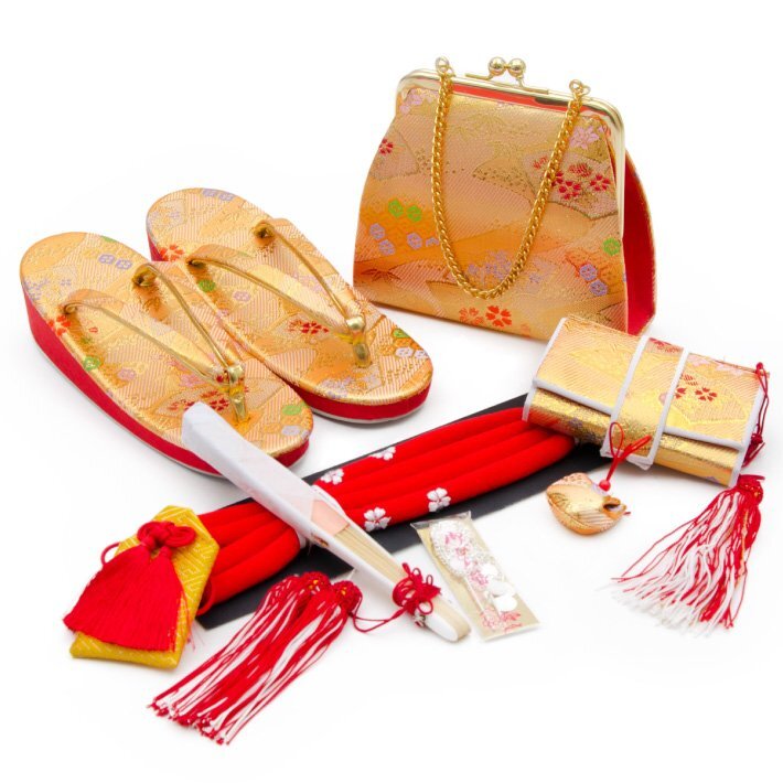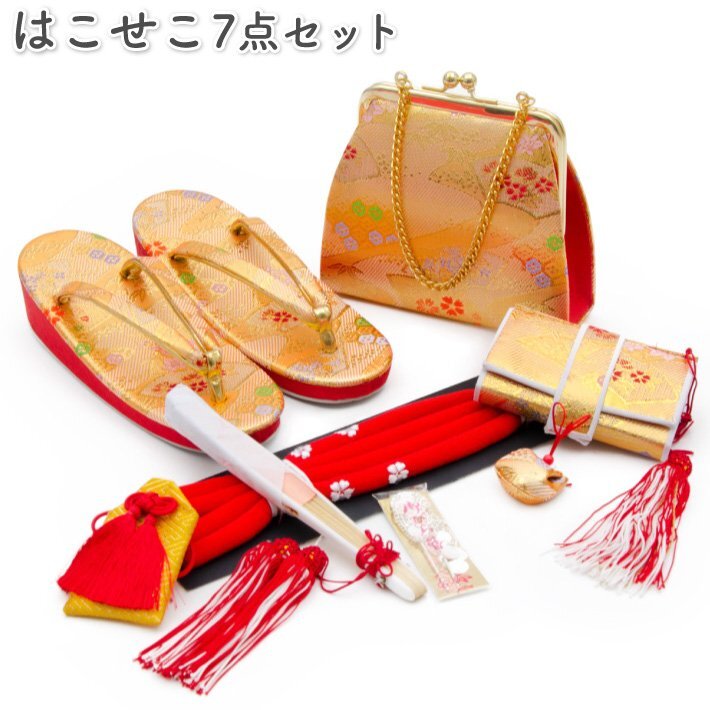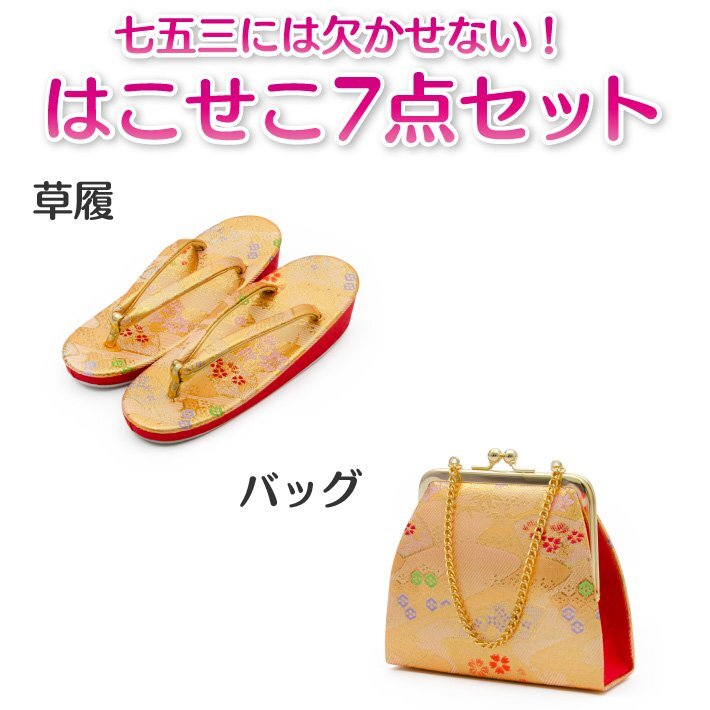 七五三、七歳のお祝いには欠かせないはこせこ・草履バッグセットです。 必要な小物が揃う7点セットです。 子供様の着物姿を一層華やかにしてくれます。 豪華なゴールド・金糸で、伝統的な紋様が織られています。 |