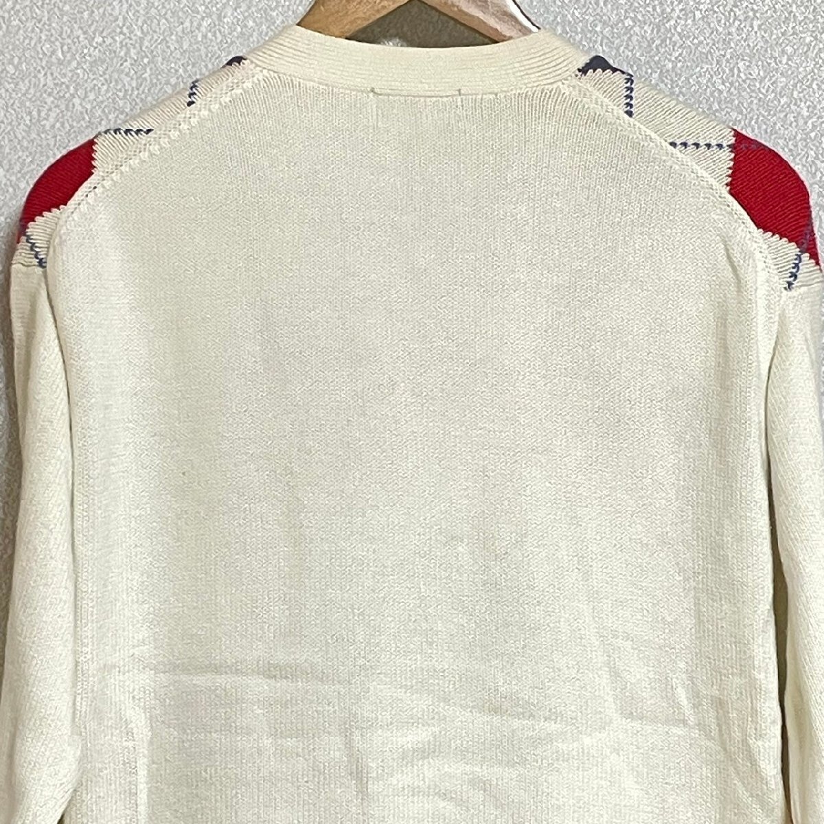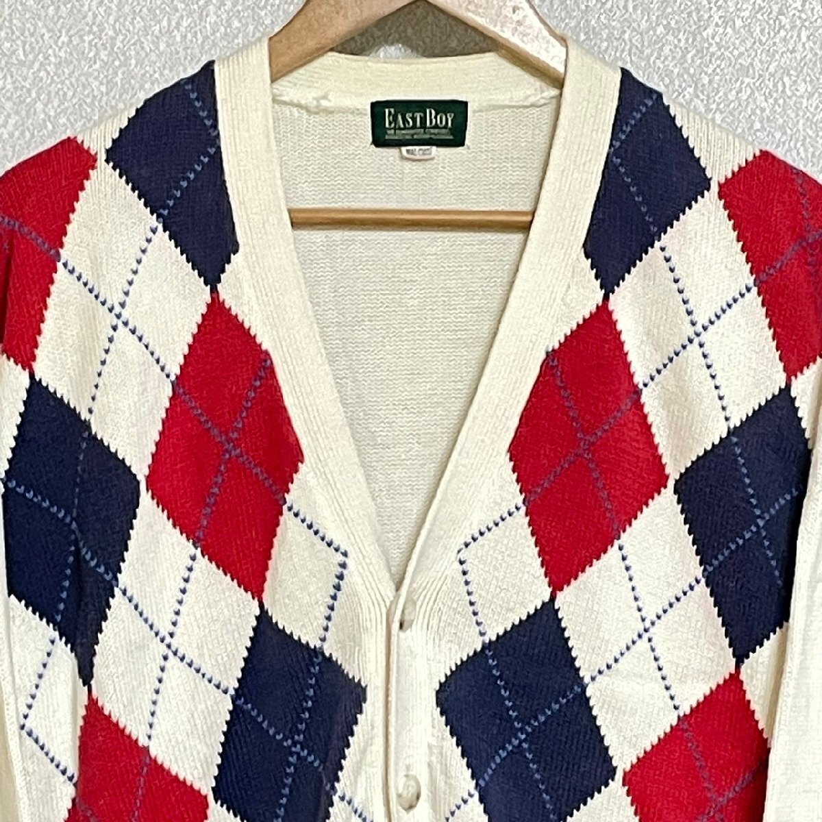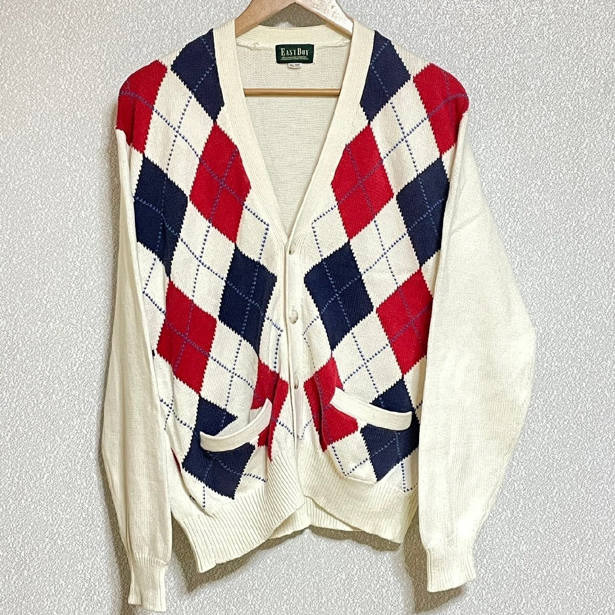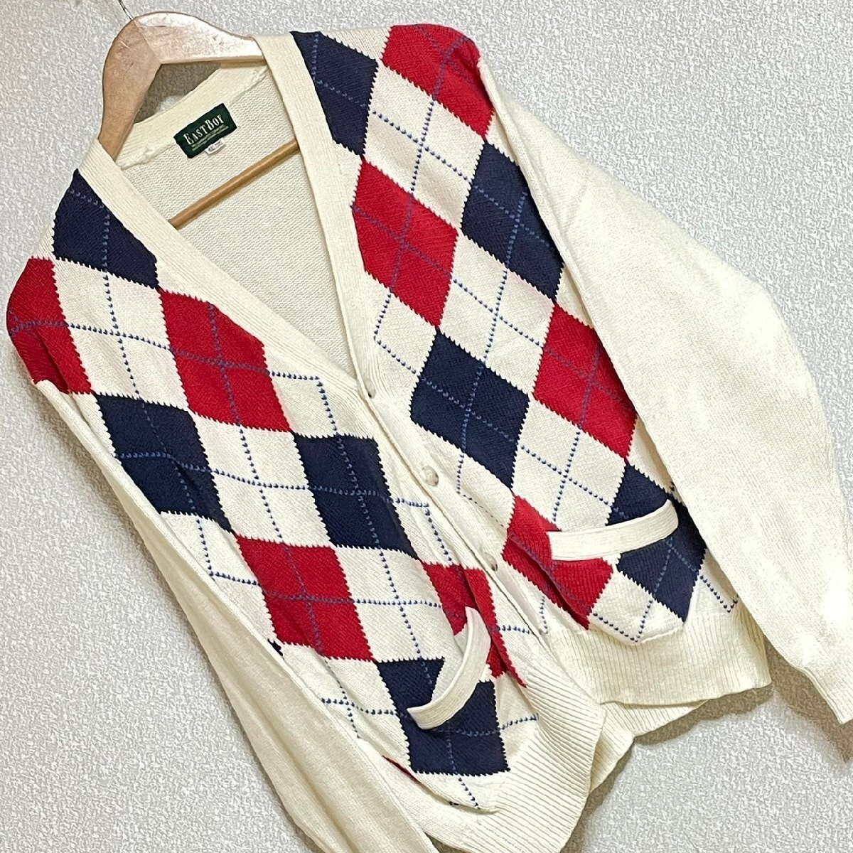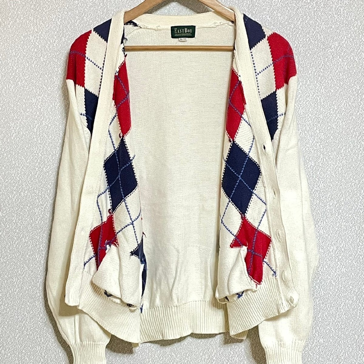 (^w^)b EASTBOY イーストボーイ 80s 90s ヴィンテージ ニット カーディガン アーガイル 柄 ポケット トリコロール カラー 白 赤 青 9327FE