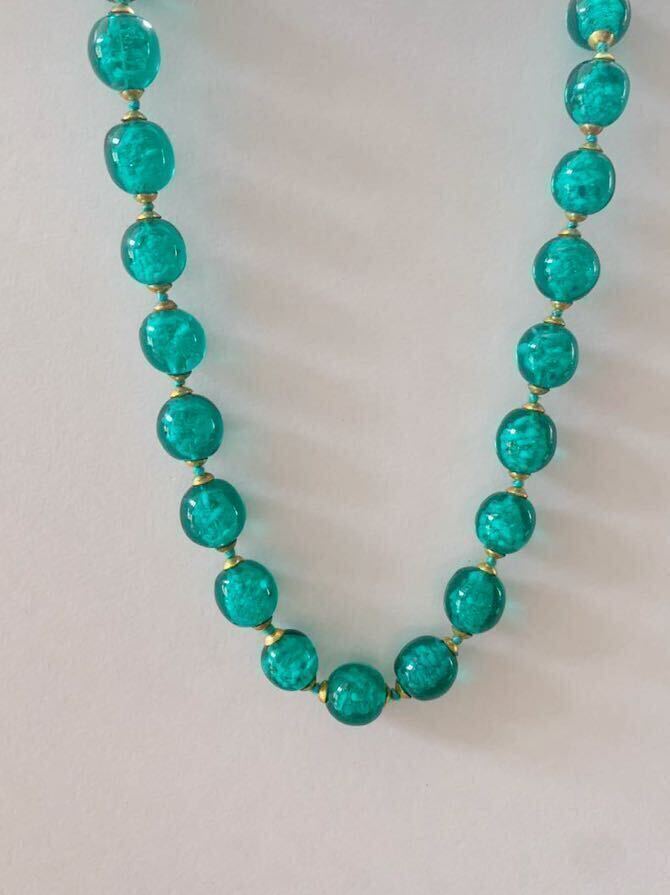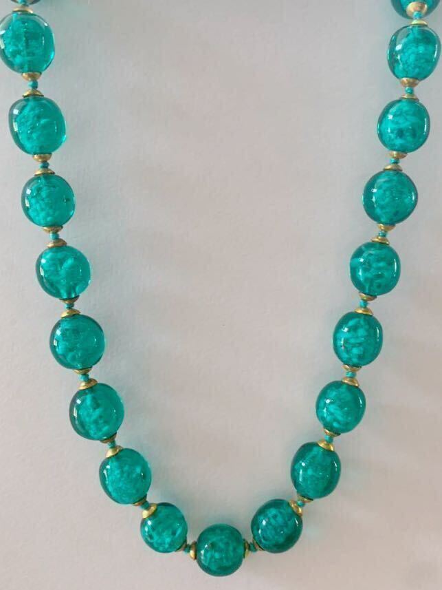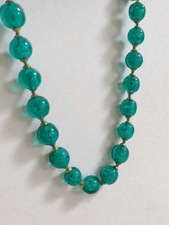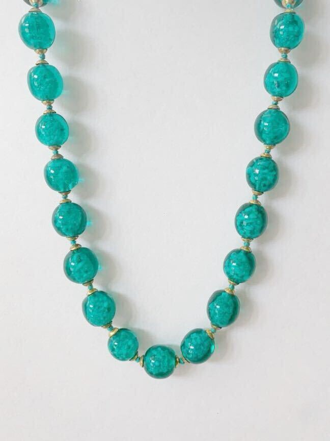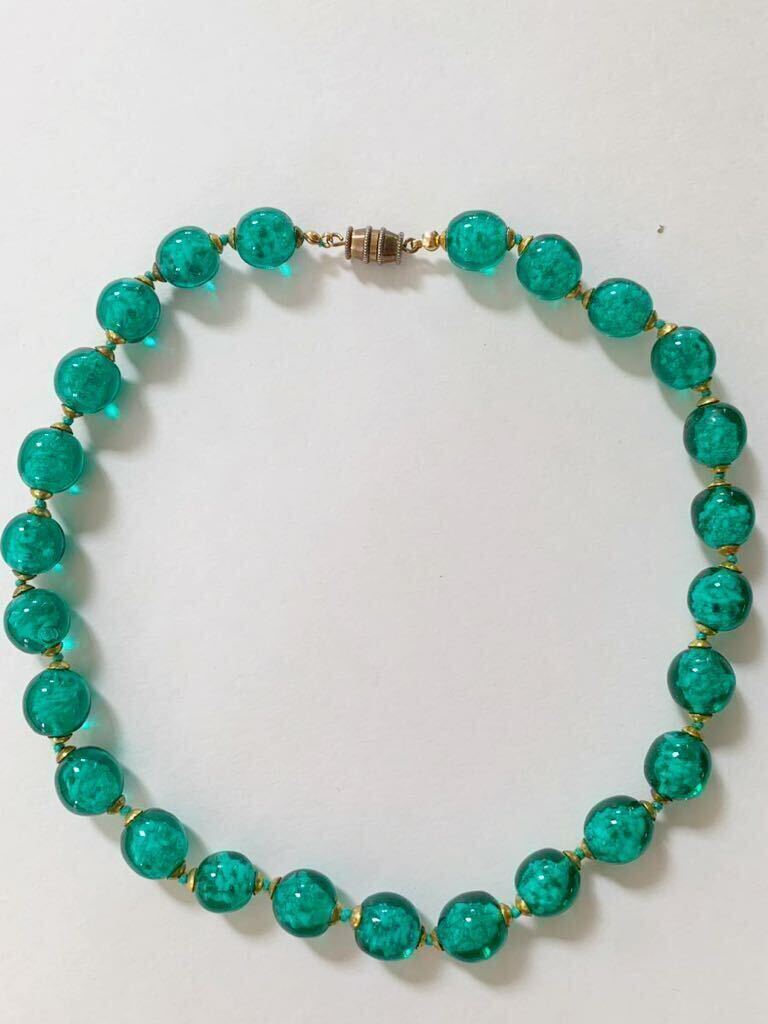【美品】ヴィンテージ エメラルドグリーン ヴェネチアンガラス ネックレス とんぼ玉 ラウンド ハンドメイドガラス オールノット