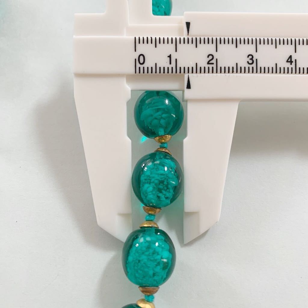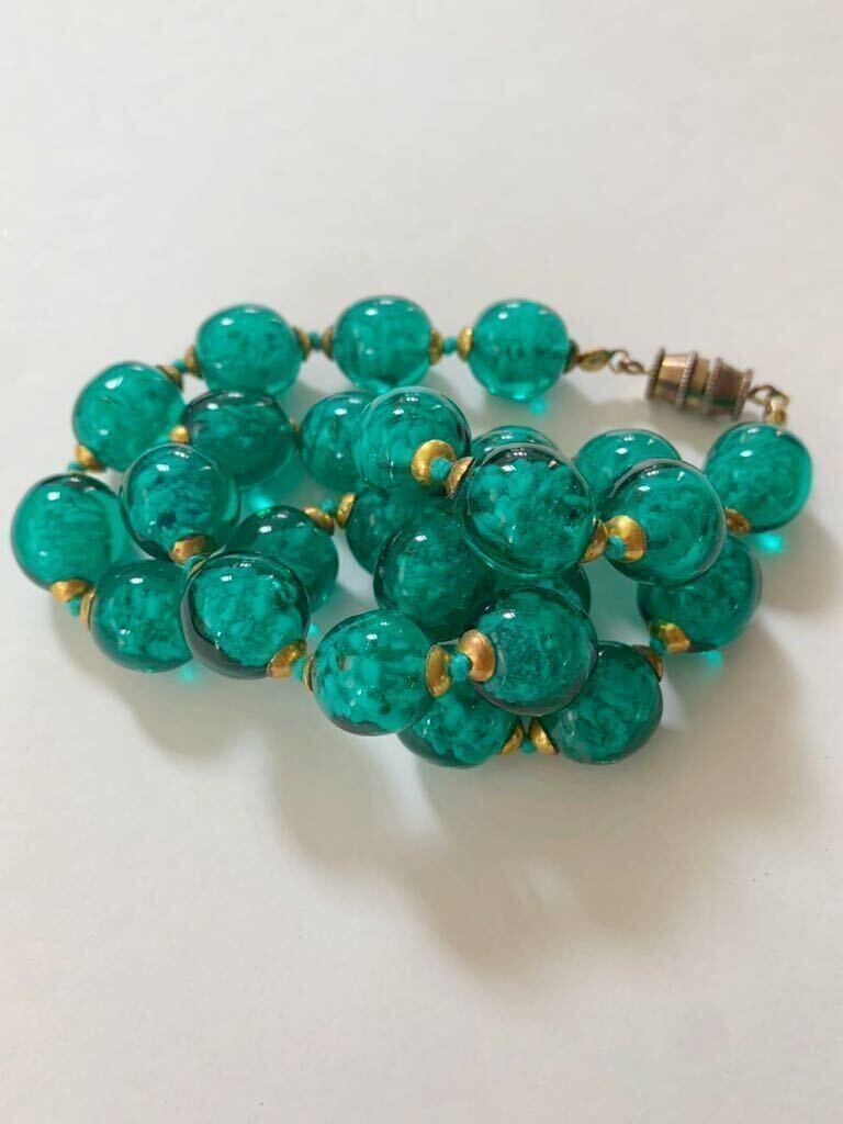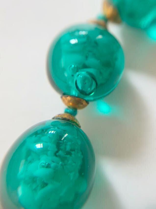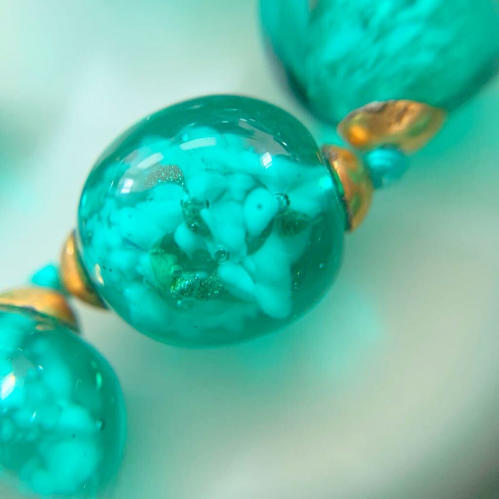 【美品】ヴィンテージ エメラルドグリーン ヴェネチアンガラス ネックレス とんぼ玉 ラウンド ハンドメイドガラス オールノット