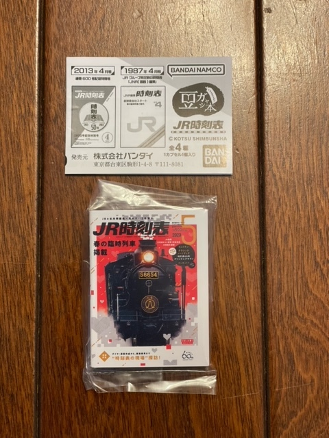 バンダイから発売の豆ガシャ本「JR時刻表 月号 2023年5月号」になります。500円ガチャだけあって小さなサイズながら全ページびしり印刷されています。大きさは縦5センチ、横3.4センチくらいです。ビニールシート入り(最初から密封式ではありません)、リスト付きになります。