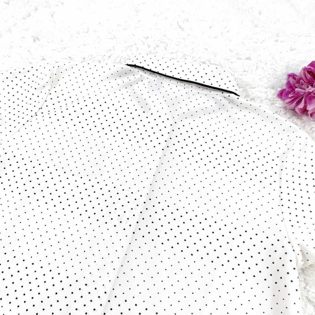 ホワイトベースに、大小のドット柄の総柄デザインで、左胸のワッペンもポイントのオシャレな一着です