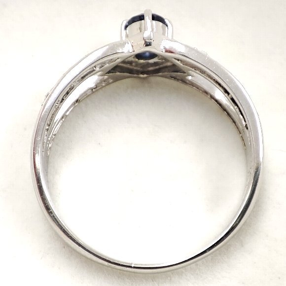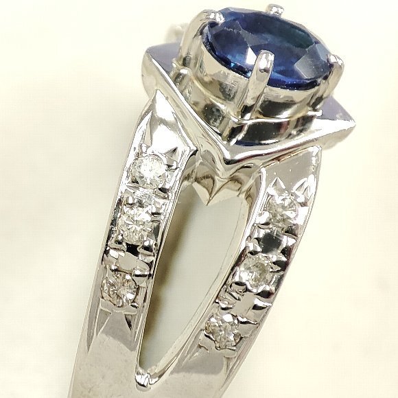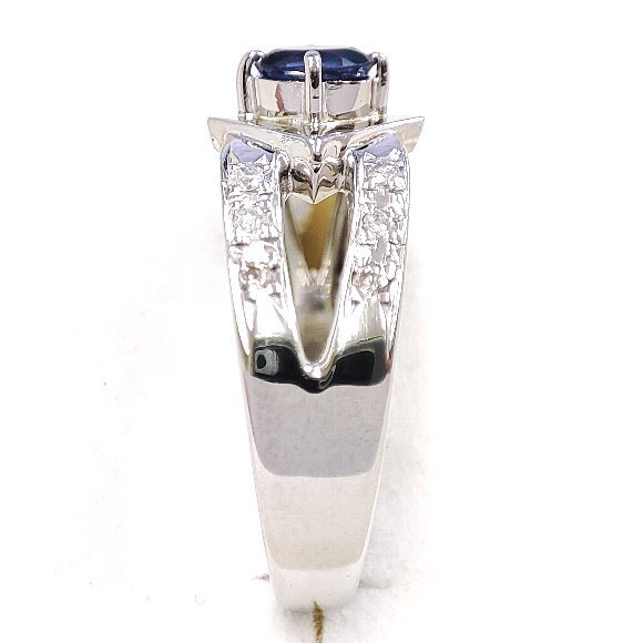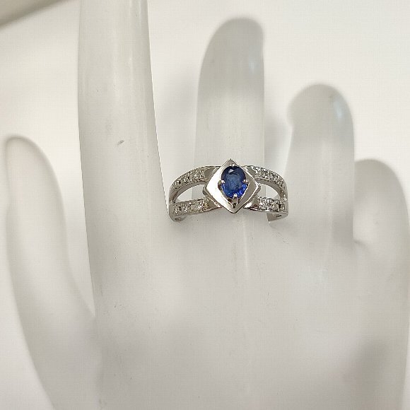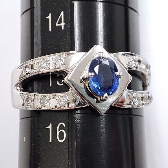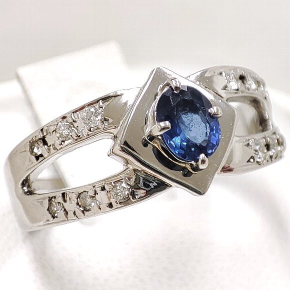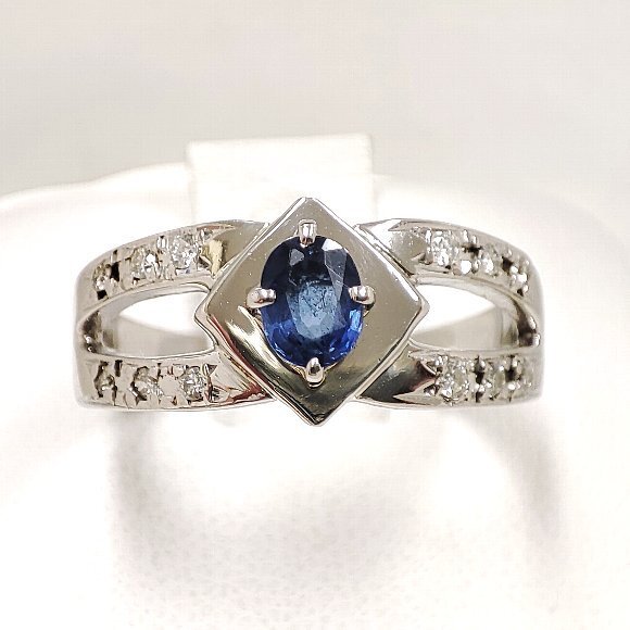 オーバルミックスカット 0.41カラットの天然サファイアをセンターにセットし リング肩部分にその周りを 合計 0.11カラット 12ピースのメレダイヤモンドで飾られたリングです。サファイアは、インクルージョンも目立たず擦れキズは やや有るものの高品質でやや濃いめのブルーのお色に透明感は深く大変綺麗です。リングサイズは、15.5号で素材は、プラチナ900です。サファイアを取り巻くダイヤモンドのクラリティは主観になりますが、SIクラスから Iクラスになります。輝きはあり綺麗です。 |