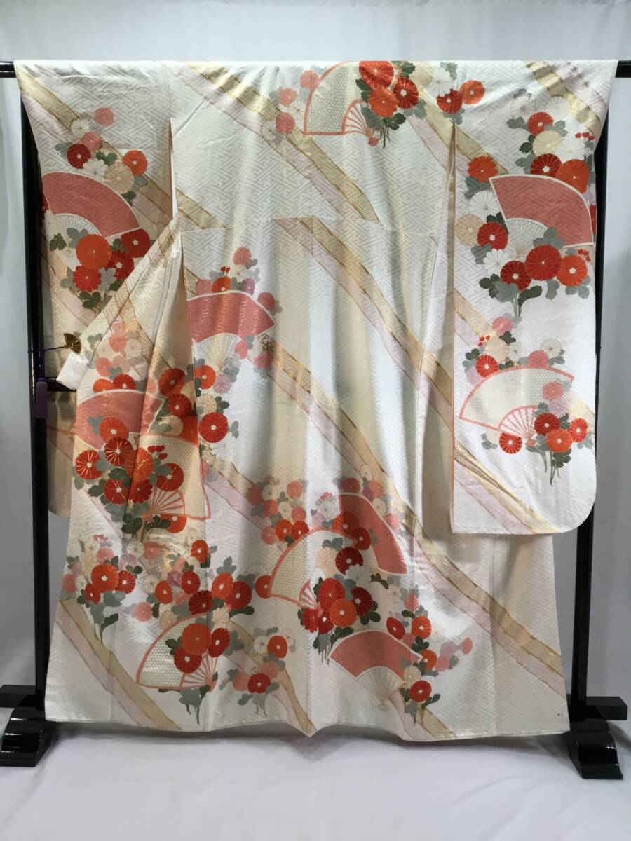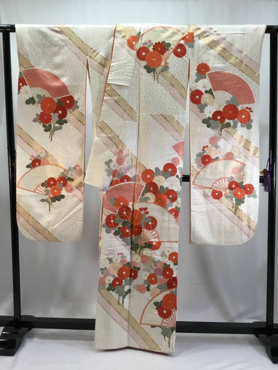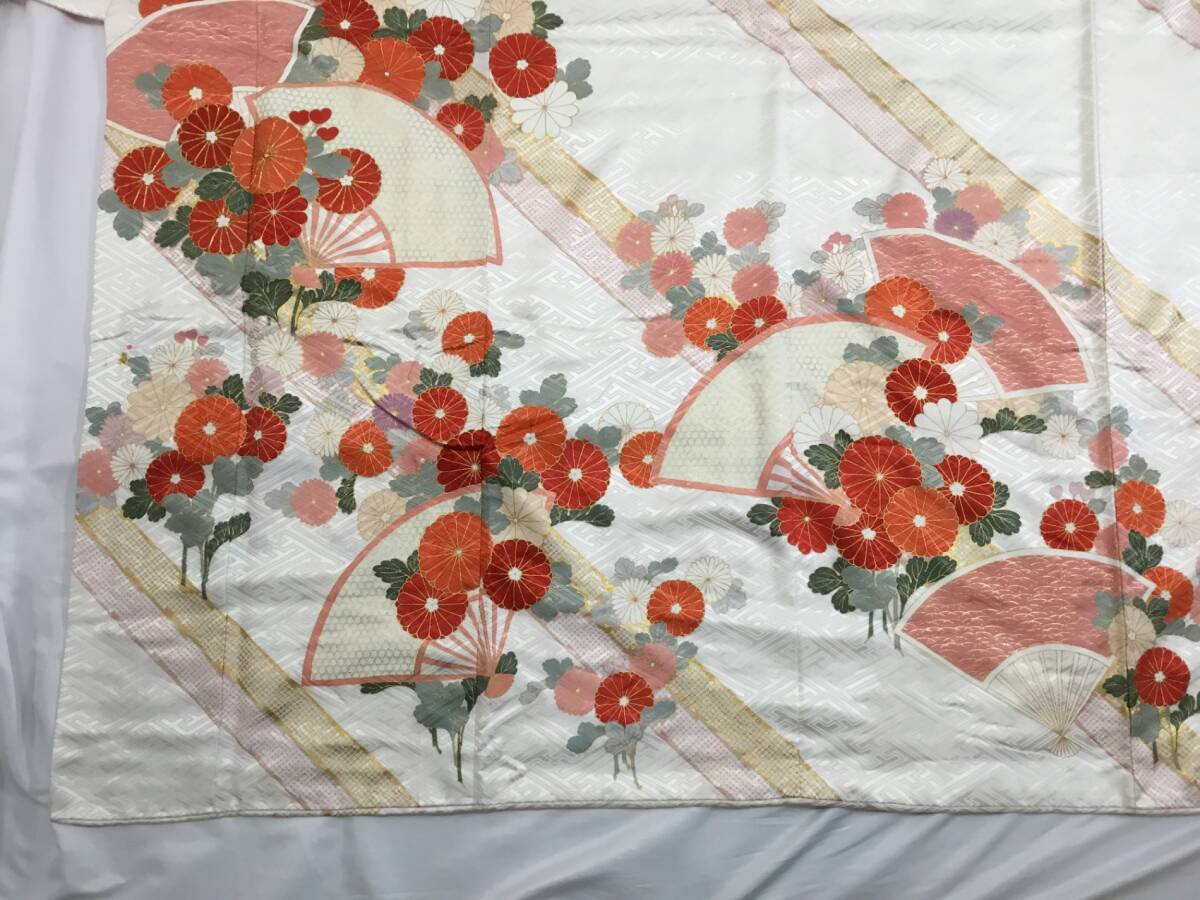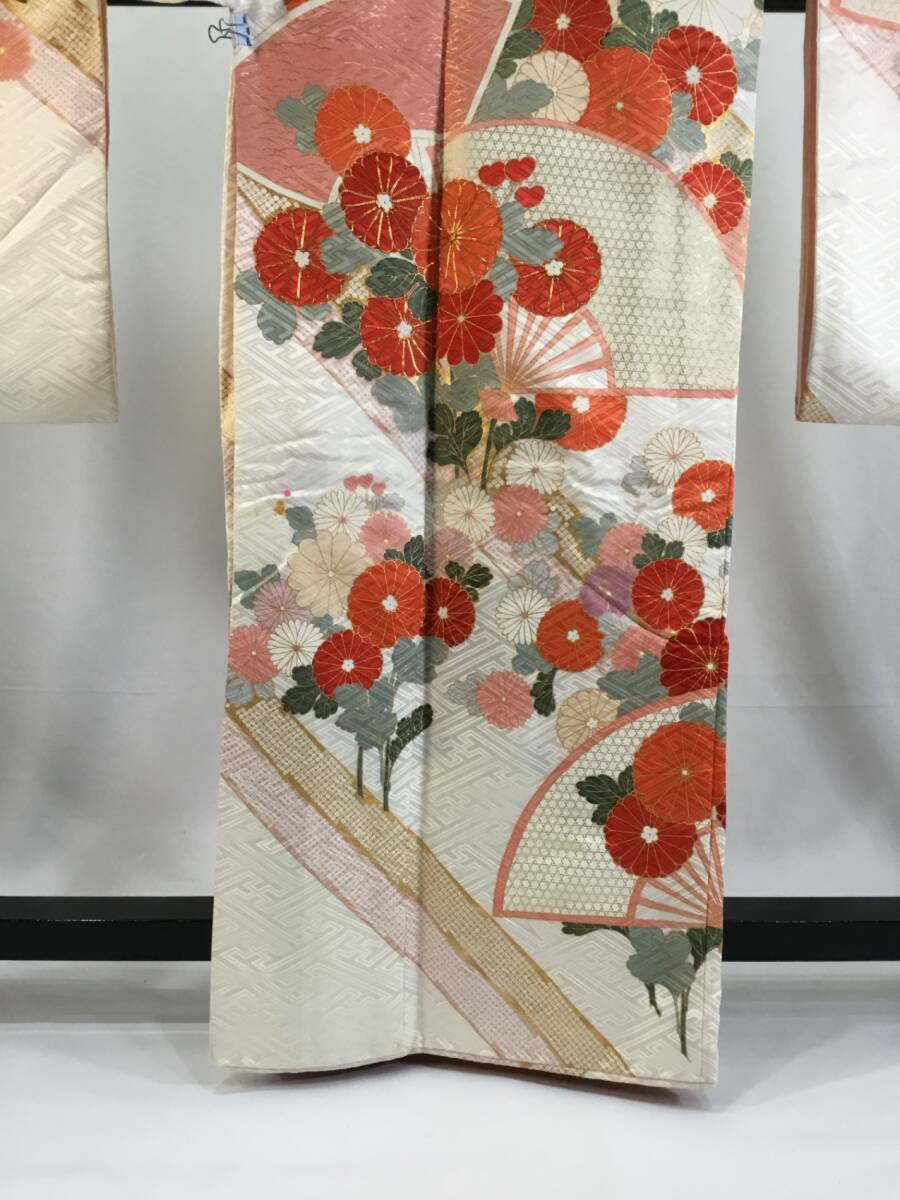 本振袖/美品/正絹/白地/扇と菊/重衿付/比翼/仕立上がり/適応身長147~155㎝/7030 |