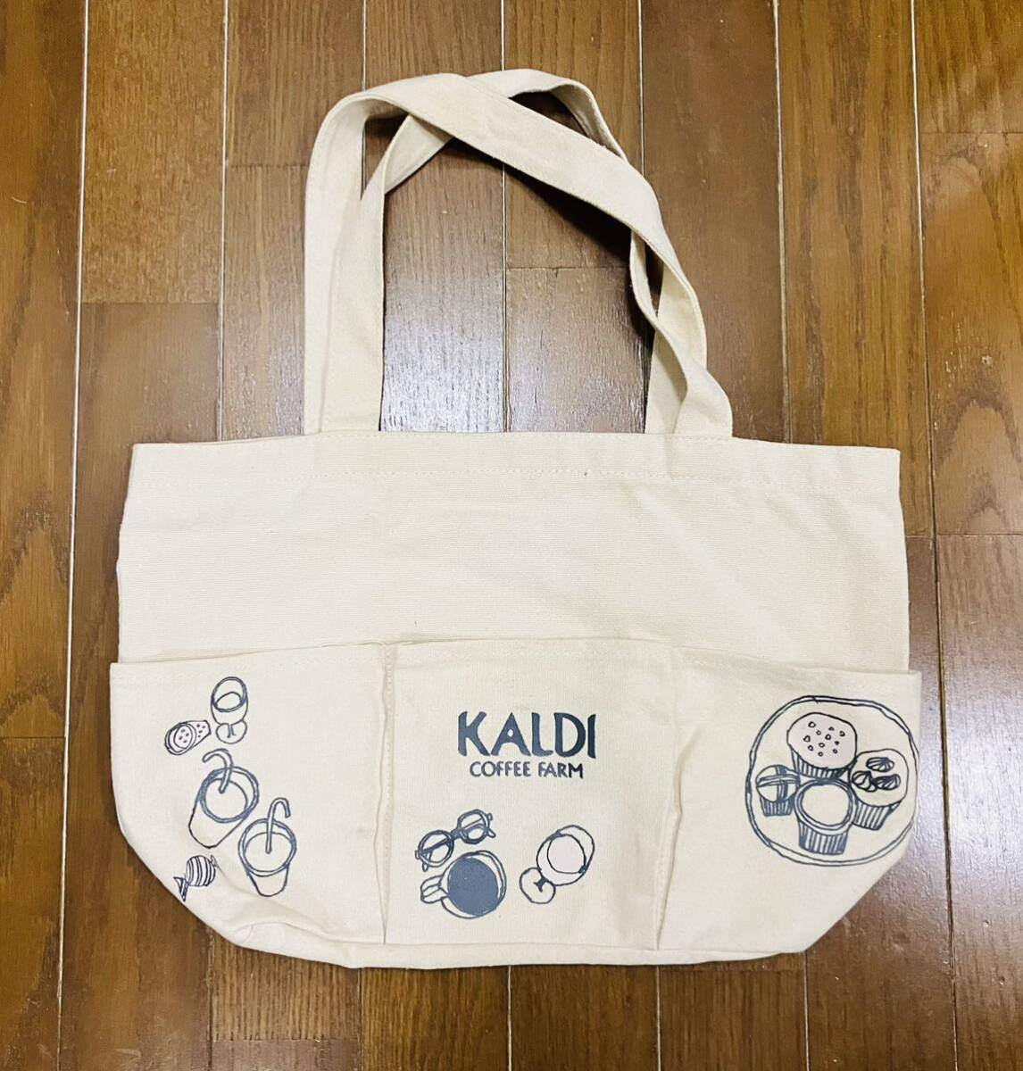 カルディのロゴ入り大きめキャンバストートバッグです☆肩掛けもできます☆外側にポケットが3個あり、収納力があるバッグです☆サイズ : 縦約28cm、横約41cm、マチ約12.5cmです☆今では手に入らない貴重なものですので、ぜひこの機会にどうぞ☆返品、クレームはお受けできません☆この他にもカルディのものなど、いろんなものを多数出品致しておりますのでよろしかったらご覧下さい^ - ^