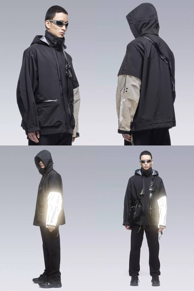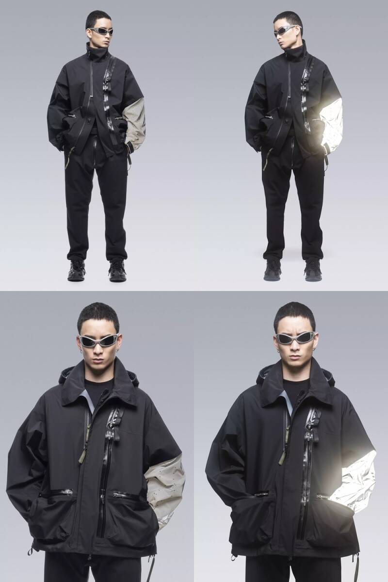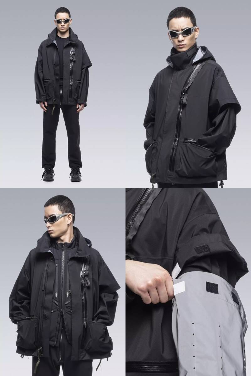 左袖はリフレクター素材の脱着スリーブとなっており、 スリーブを取り外すことでレイヤードスリーブのようなデザインとなりシンプルな雰囲気で着用していただけます。