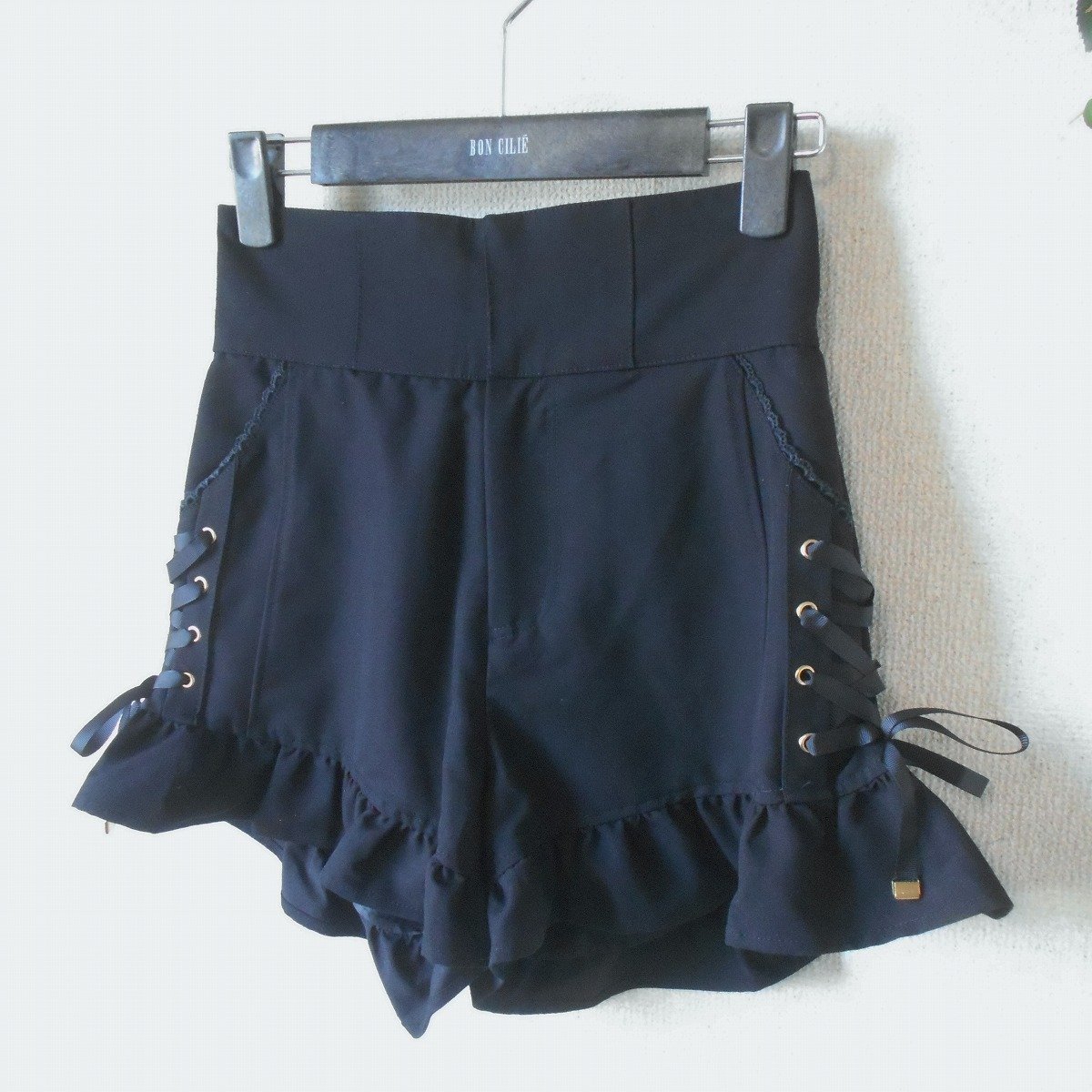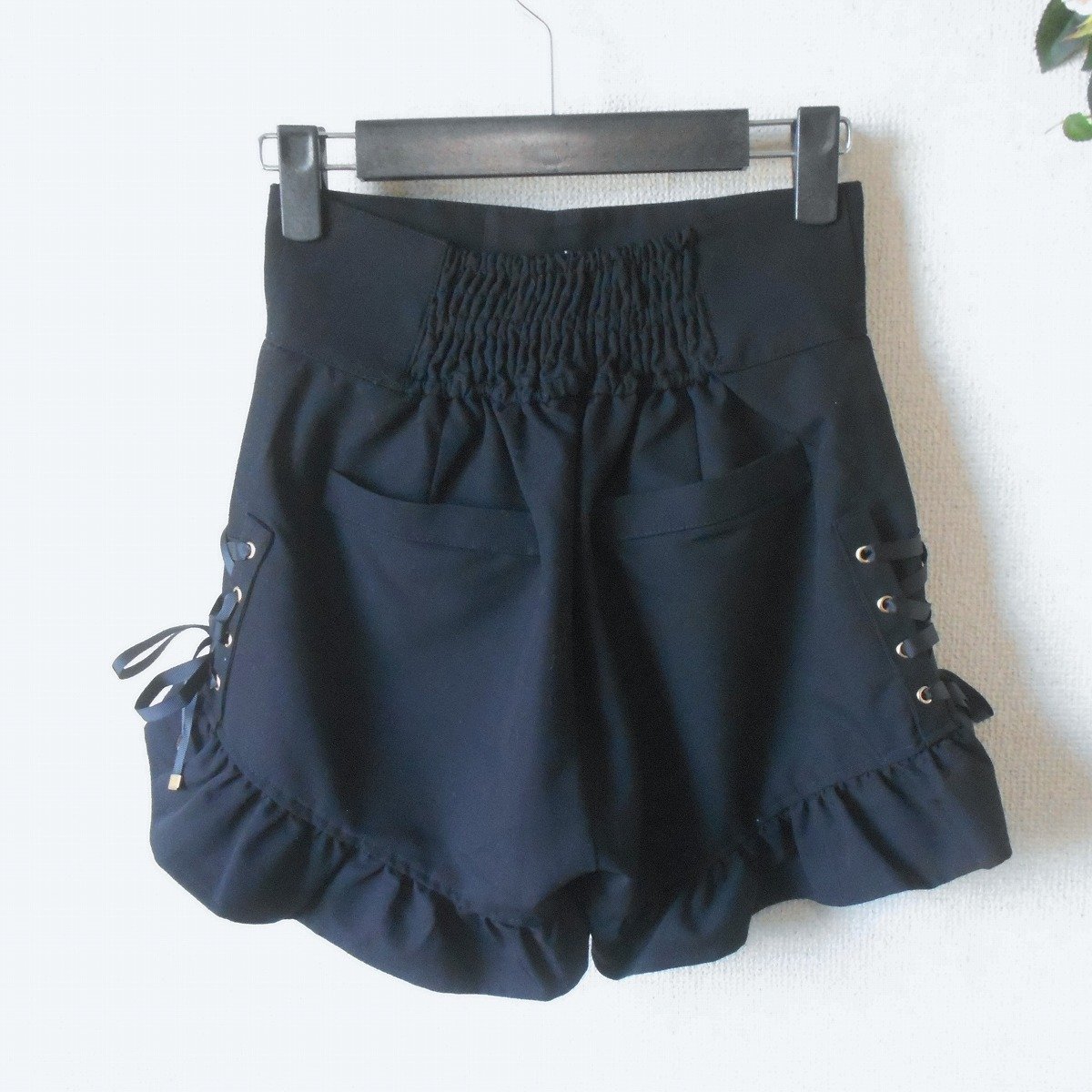 【ポイント】リズリサのショートパンツになります。お色は黒色で、裾にはフリル、サイドにはレースアップリボンが使用されたとっても素敵なデザインです。