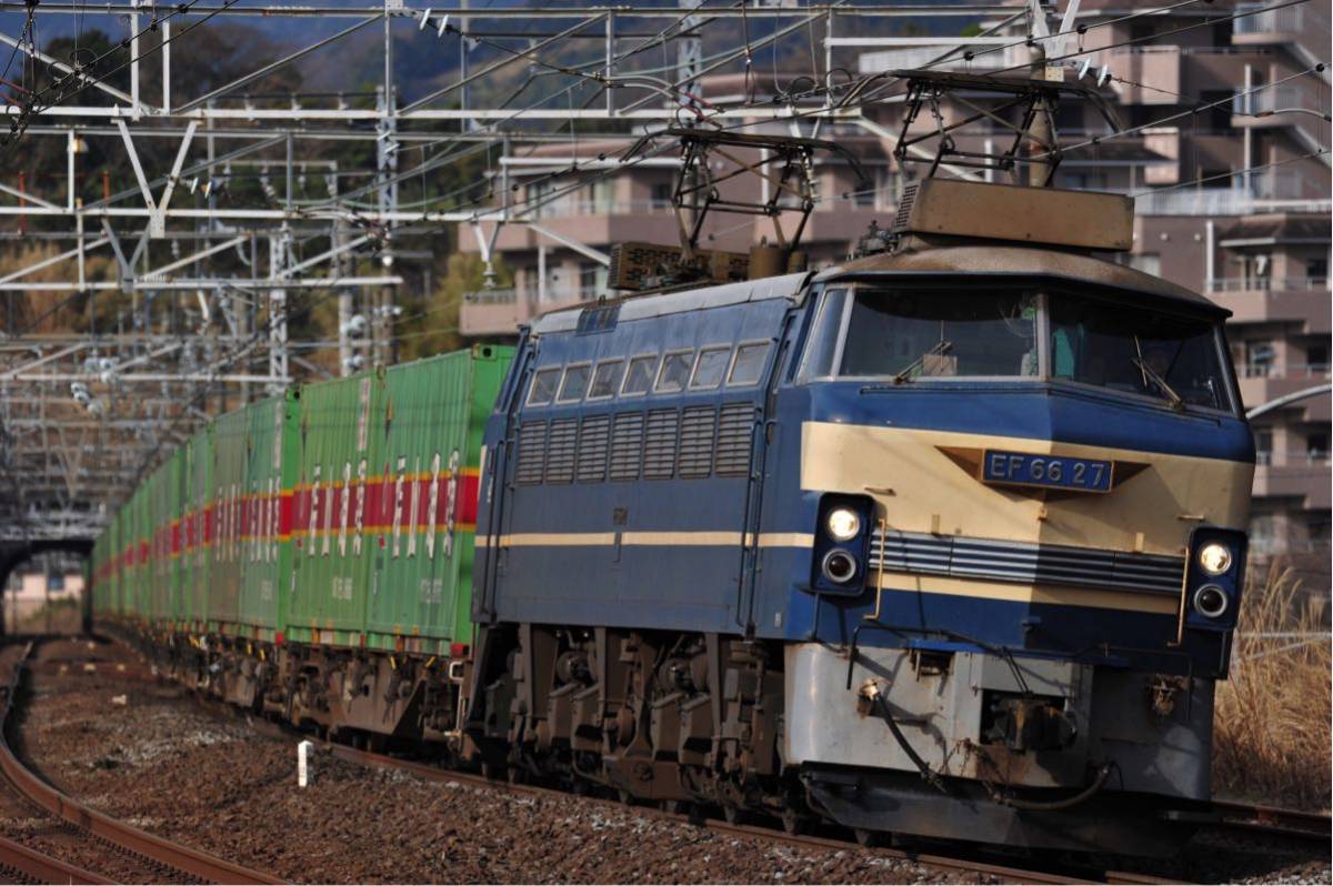 出品の写真は東海道線、湯河原~真鶴間の走るEF66牽引の福山通運の貨物列車の写真でございます。