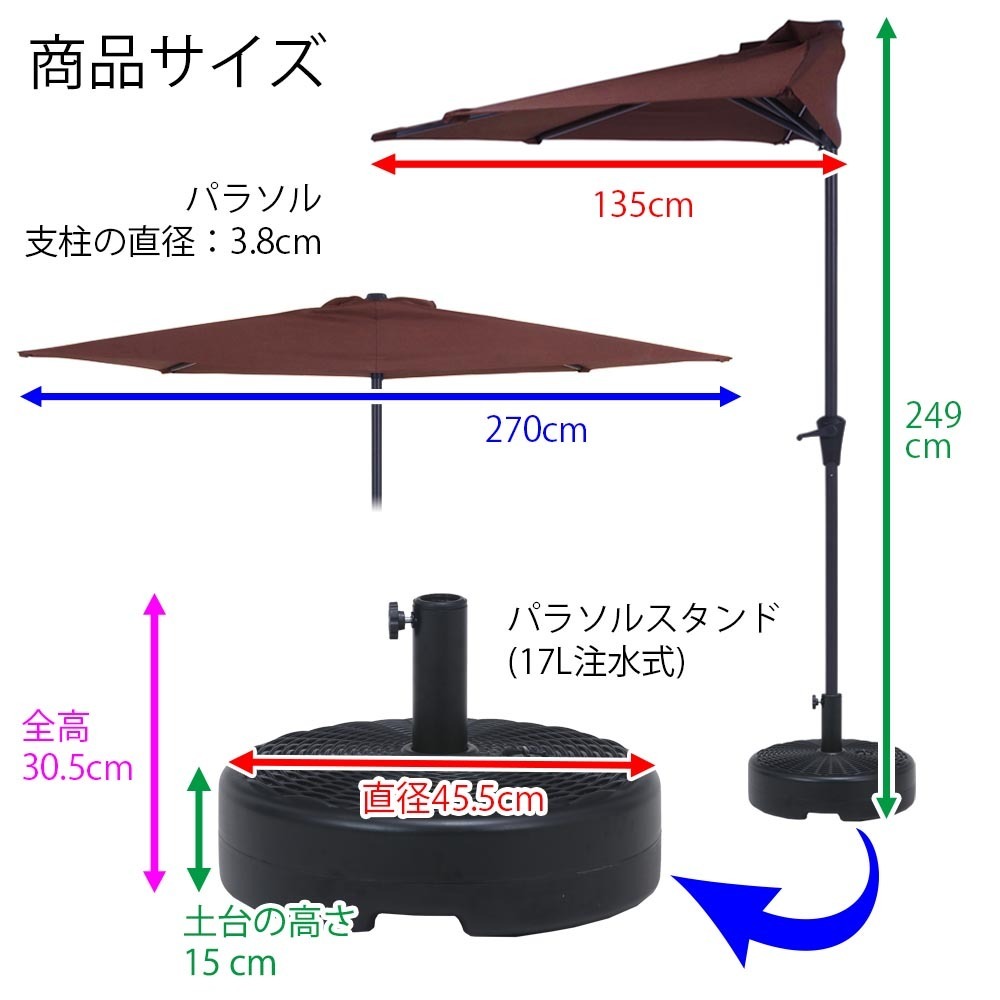 ガーデンやテラスに人気の半円パラソルと、全円ウォーターベース(土台)の2点セットです。