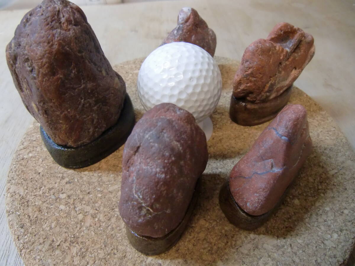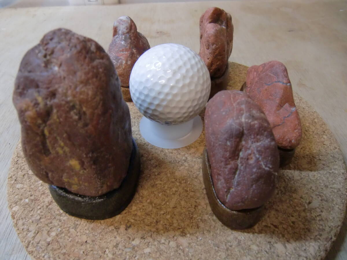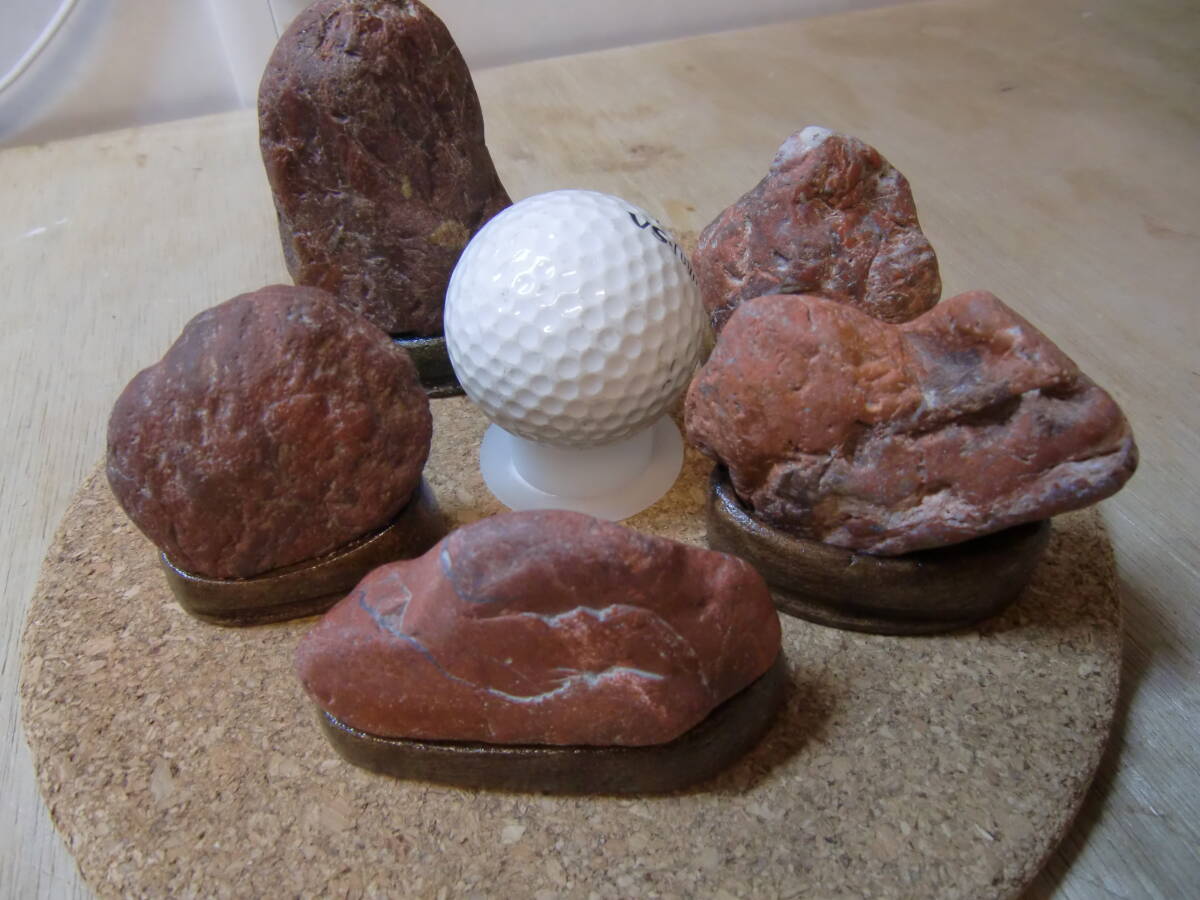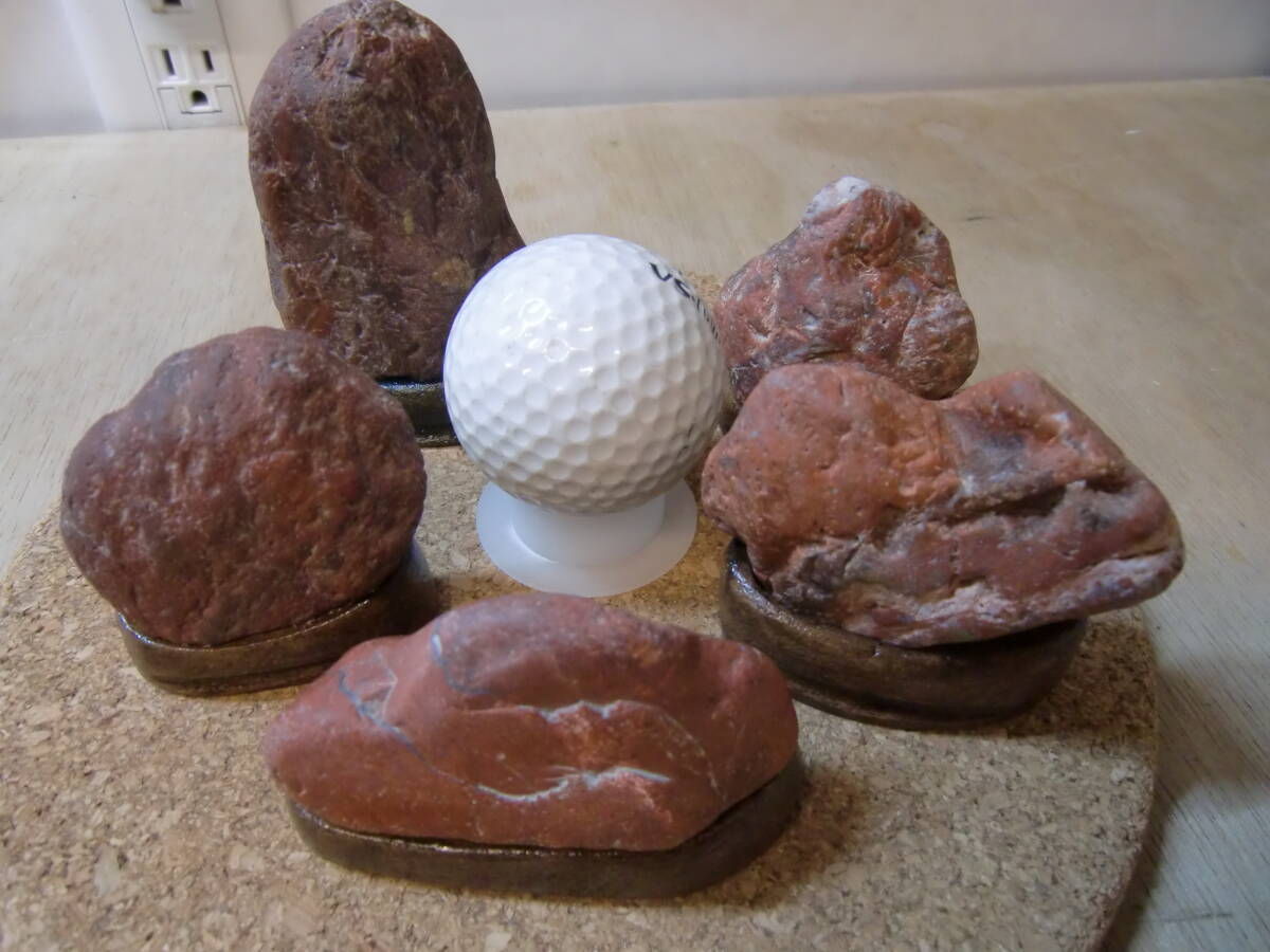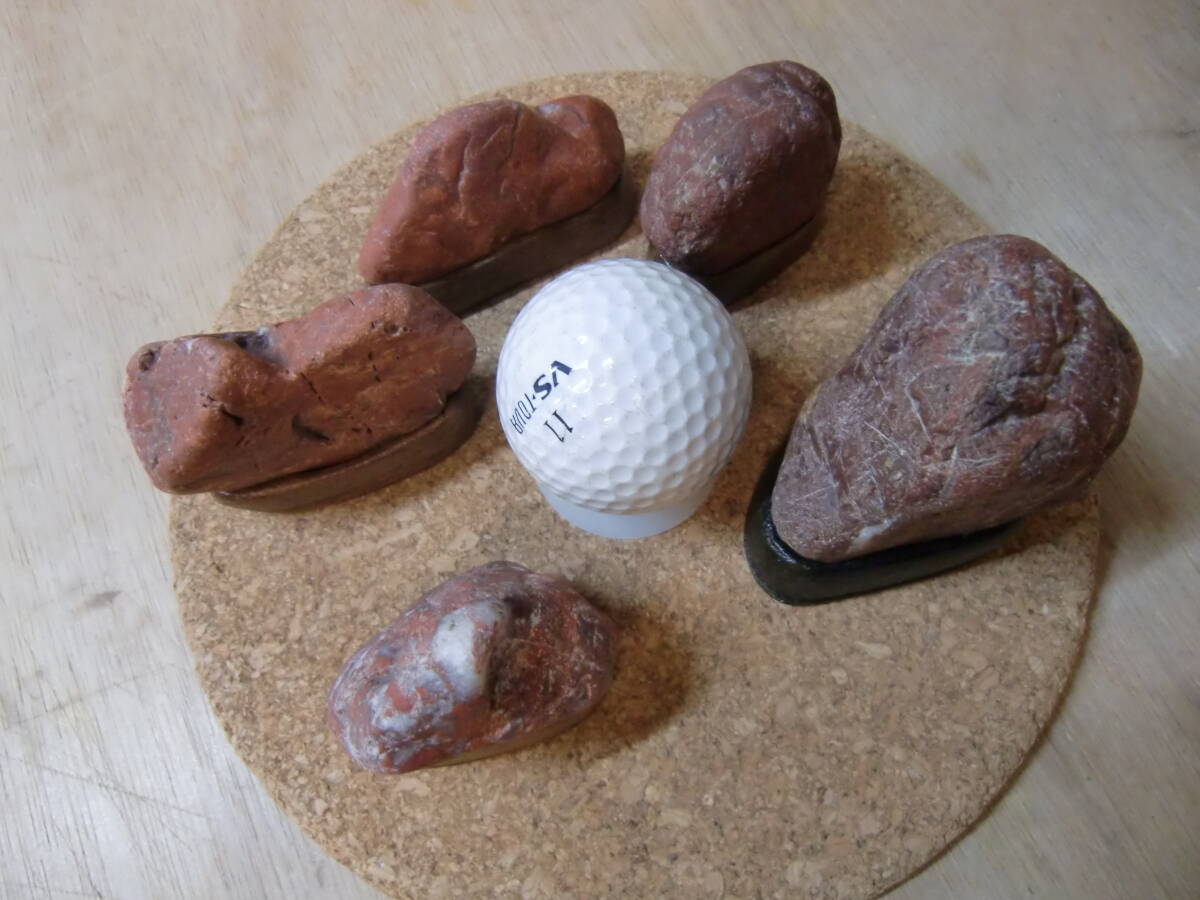 ①大きさは写し込みのゴルフボールを参照にしてください、重さは5ケで450gです。台座は木粉粘土製です。