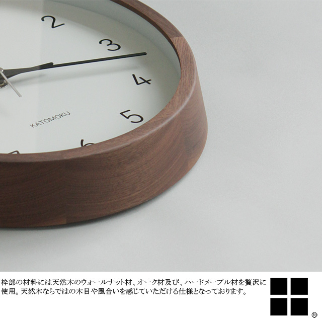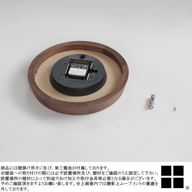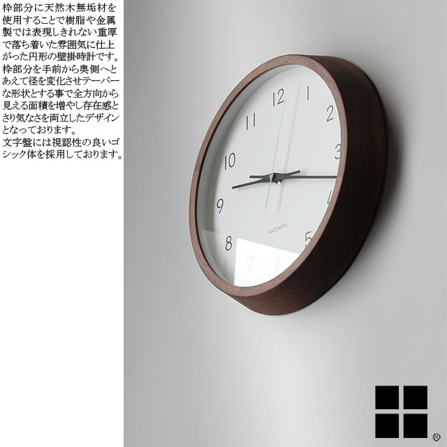 枠部分に天然木無垢材を使用することで樹脂や金属製では表現しきれない重厚で落ち着いた雰囲気に仕上がった円形の壁掛時計です。 枠部分を手前から奥側へとあえて径を変化させテーパーな形状とする事で全方向から見える面積を増やし存在感とさり気なさを両立したデザインとなっております。 文字盤には視認性の良いゴシック体を採用しております。 枠部の材料には天然木のウォールナット材、オーク材及び、ハードメープル材を贅沢に使用。天然木ならではの木目や風合いを感じていただける仕様となっております。 ※壁面への取り付けの際には必ず設置場所及び、壁材をご確認のうえ固定して下さい。 設置場所の壁材によって別途穴あけ加工や取付金具などを必要となる場合がございます。予めご確認頂きますようお願い致します。 商品重量約900g |