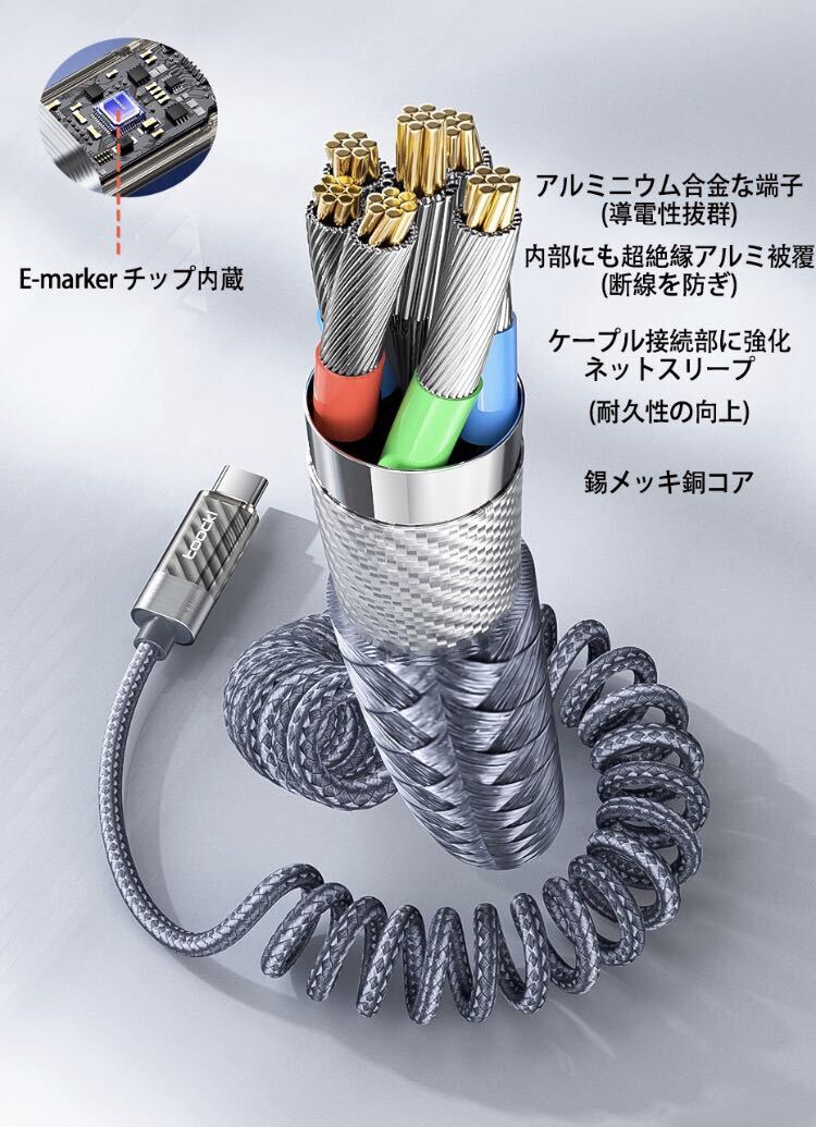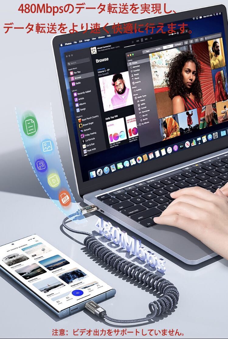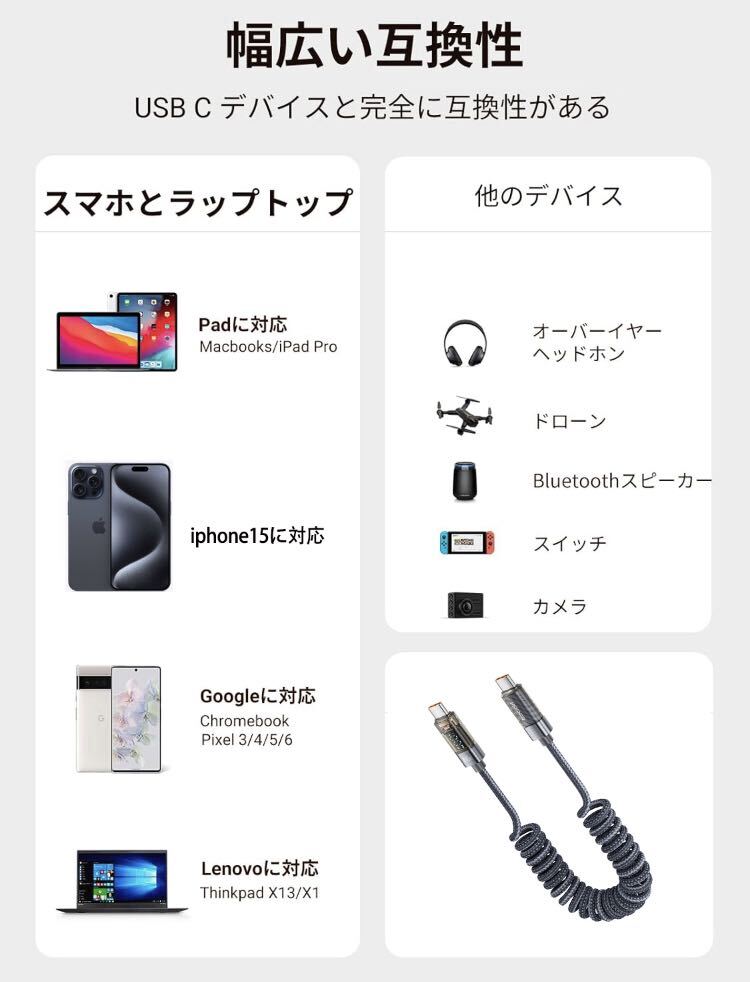 【柔軟で弾力性がある】usb c ケーブルはスパイラル形状なので持ち運びや収納が簡単で便利で、ケーブルが絡まらずに簡単に収納できます。 車での使用に最適です。 伸縮性と耐久性に優れた仕様のため、多少の伸縮性と重量がございますので、ご使用後のお取り扱いには十分ご注意ください。 限界を超えて伸ばさないでください。