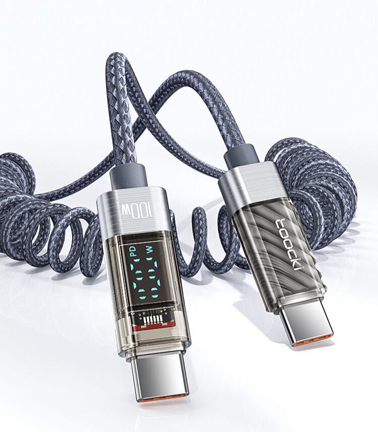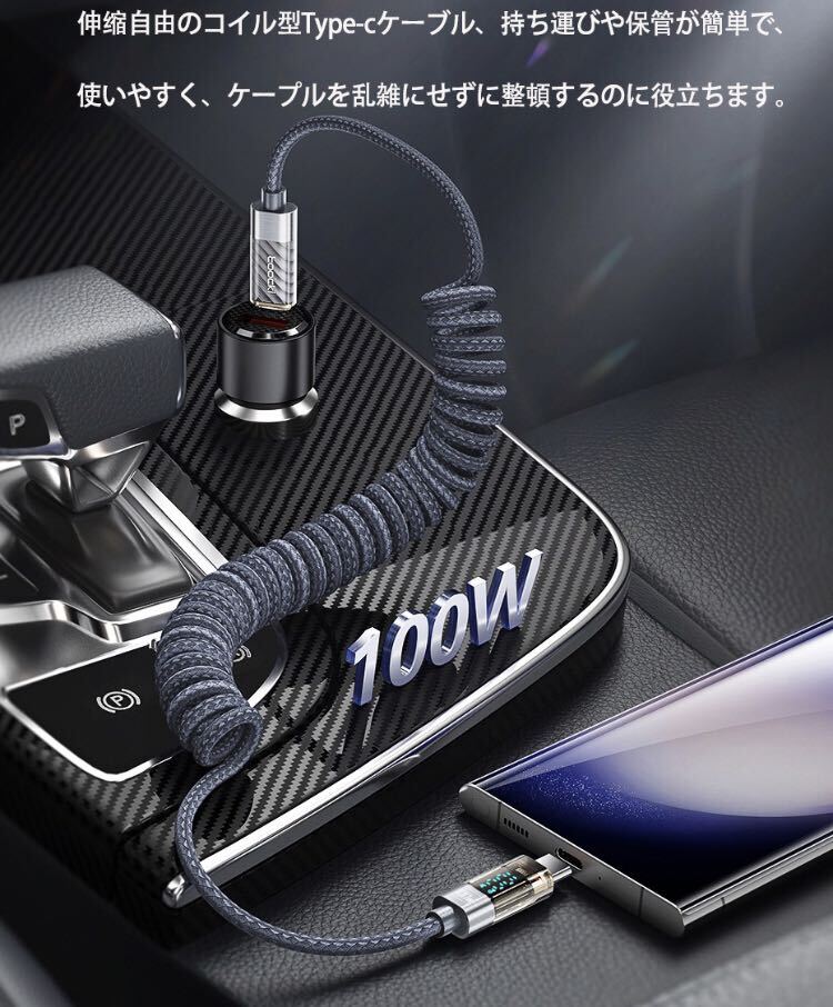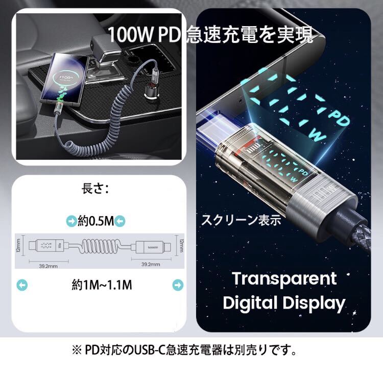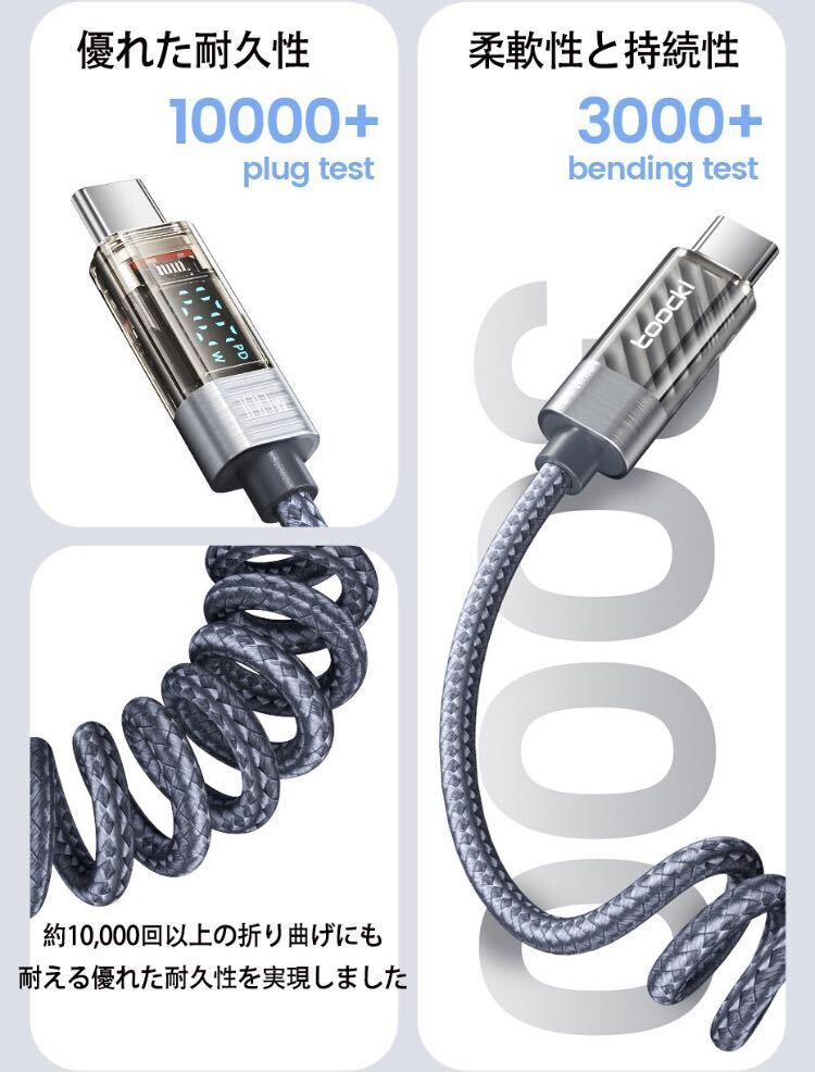 Type Cケーブル【1M】コイル型 伸びる【PD対応 100W/5A急速充電 /480Mbps /スクリーン表示 】 usb c 充電ケーブル 伸縮コード 高耐久ナイロン Type Cスプリングライン