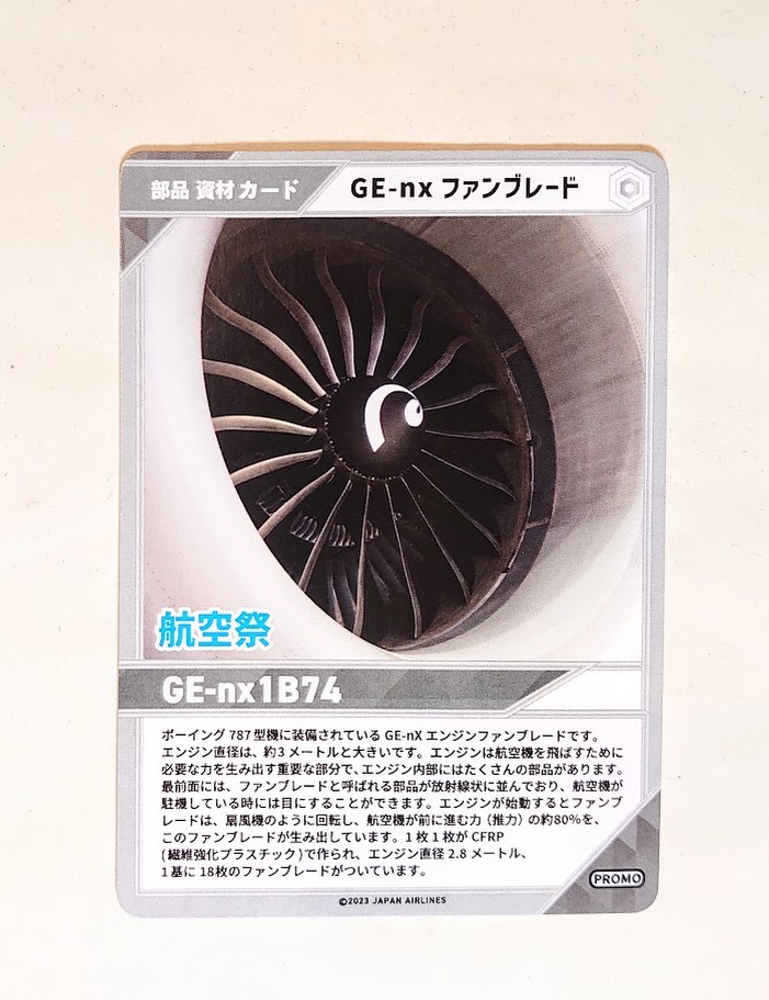 部品資材カードは、B-787 の特徴あるギザギザのエンジン、ファンブレードを紹介しています。