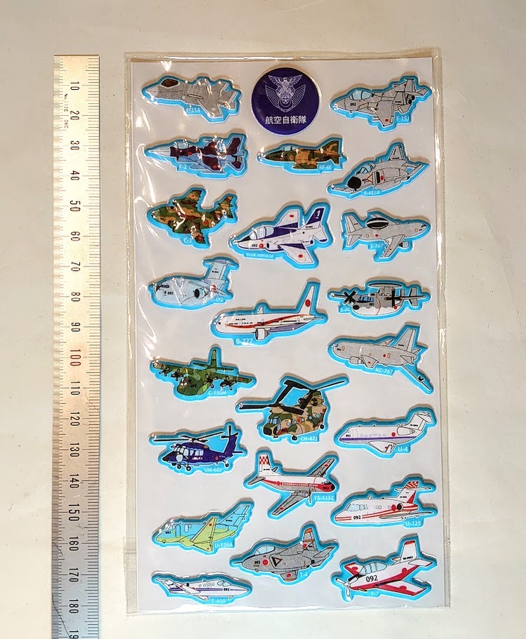 この航空ショーの目玉でもある、ブルーインパルスをはじめとした、日の丸をしょった歴史ある飛行機たちが勢揃いのシールです。輸送機、救助ヘリから国賓ジェット、戦闘機など、23機種の航空自衛隊機を模した、プラスティック製の高級感溢れるシールは、子供だけでなく航空ファンの大人達にも大人気です。