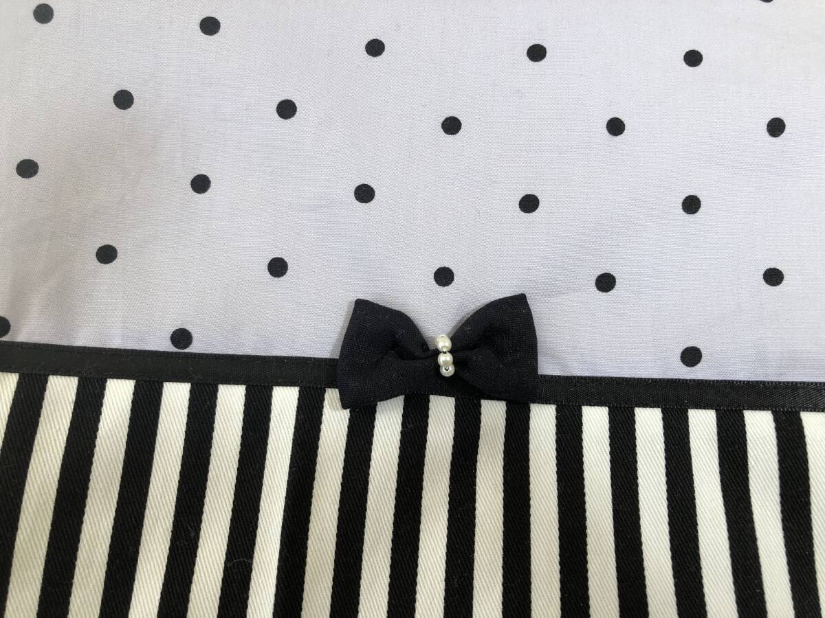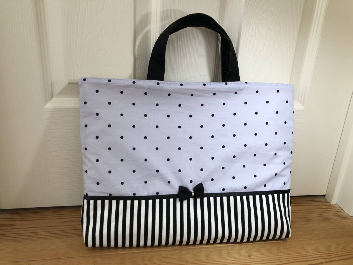 グレーがかったパープルのドット柄に切り替えで黒のストライプを使用したレッスンバックになります。