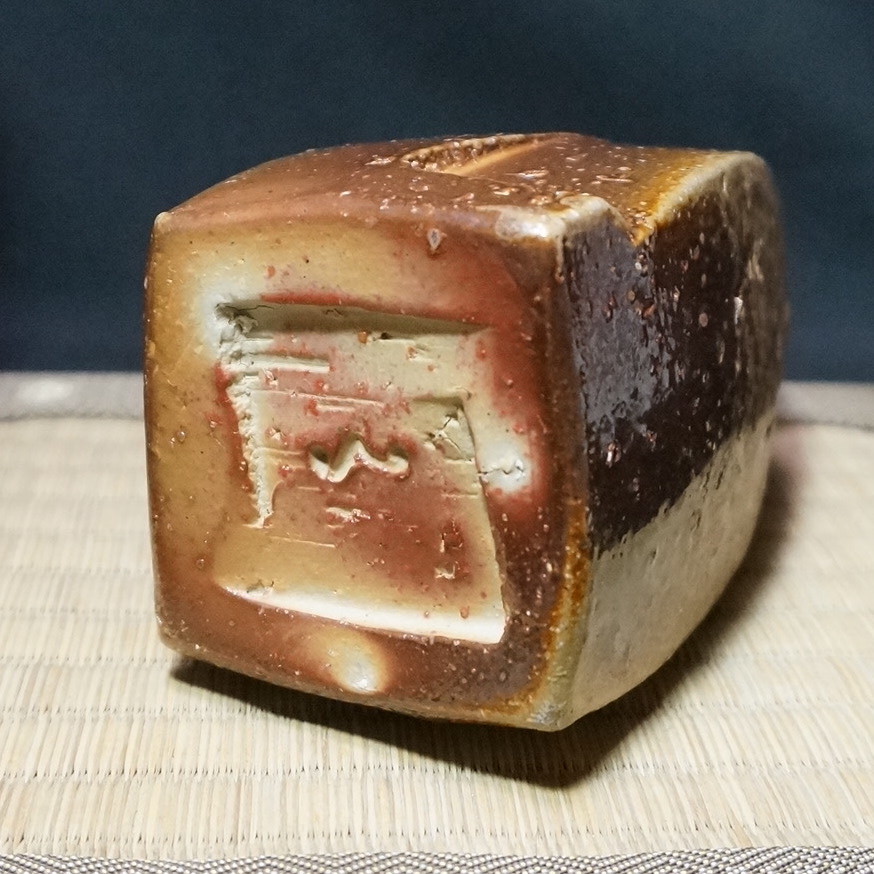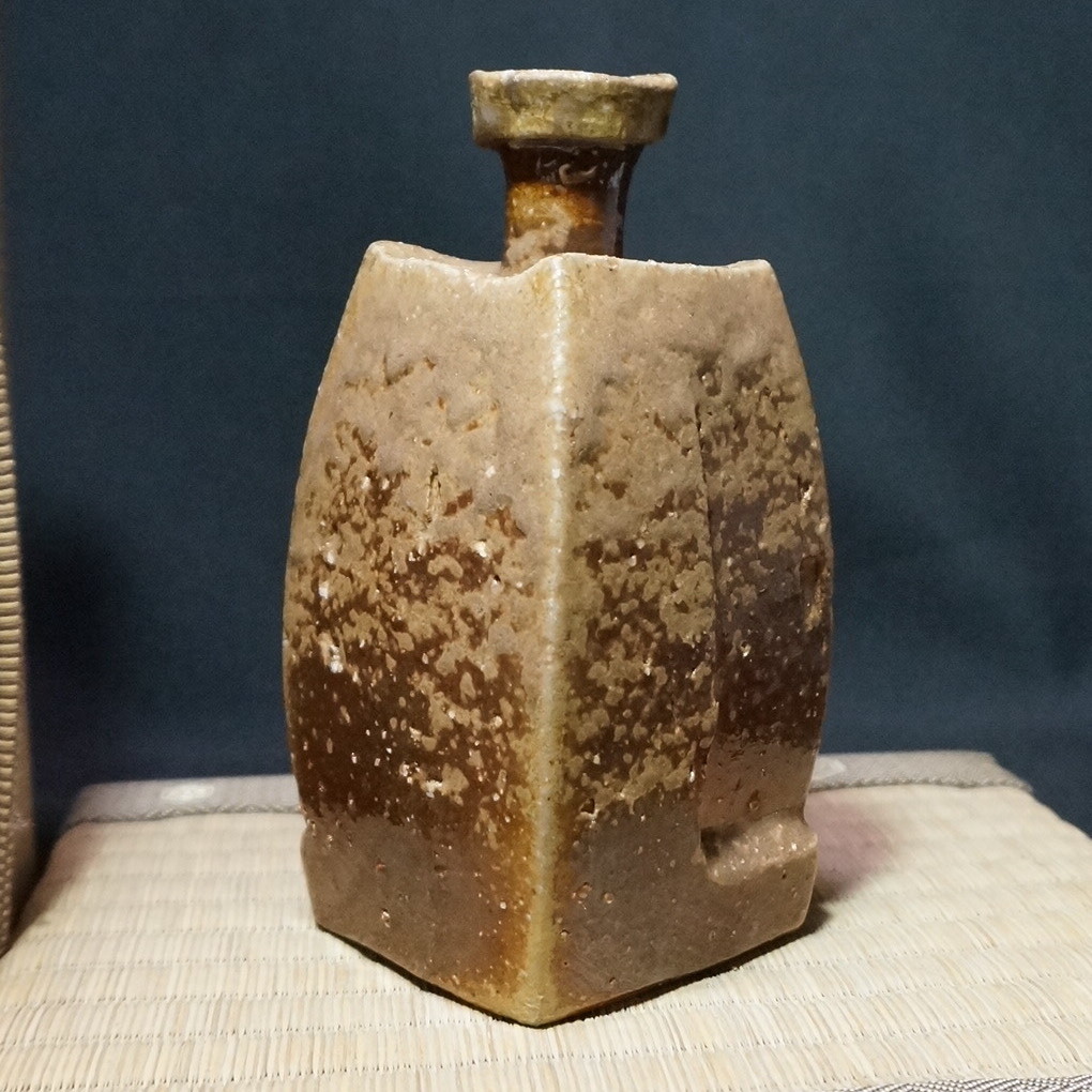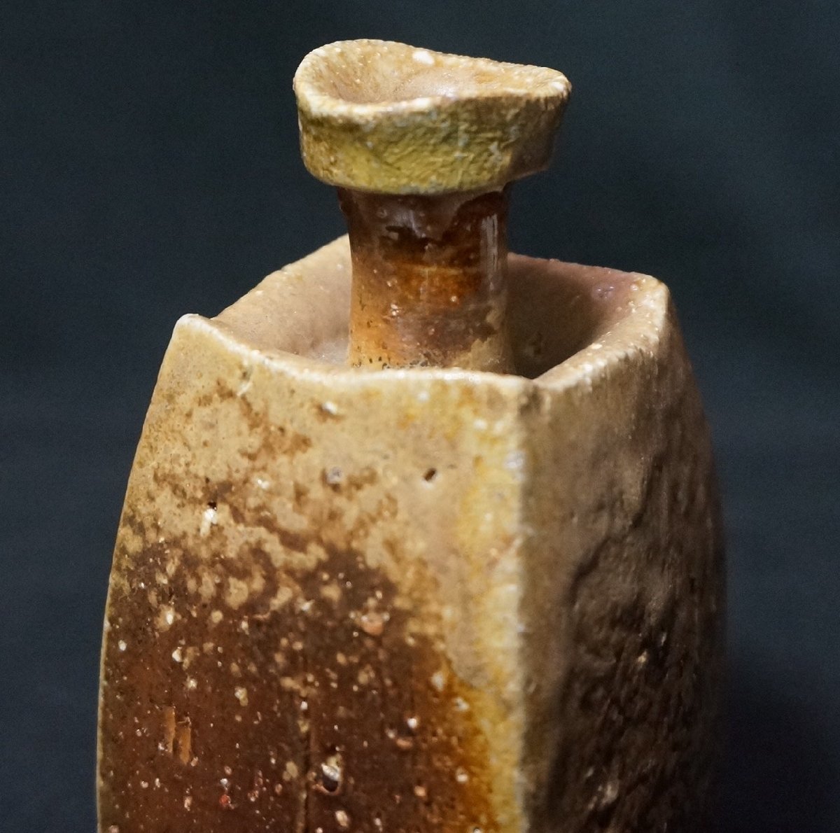 備前焼界のみならず世界に名高い異色の備前焼作家 隠崎隆一先生の近作の備前酔器です。一目で隠崎先生と分かる大胆な箆使いによって作品全体が削り出されており、立体としての面白さを追求したデザインはいつまで眺めても飽きません。穴窯らしい胡麻が勢い良く吹き付けられた景色となっており、備前特有の色と胡麻の形式がぐるりと取り囲み飽きさせません。